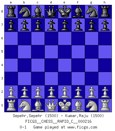 Last move : 0-1 2019 August 19 10:45:47 [Event "FICGS__CHESS__RAPID_C__000216"] [Site "FICGS"] [Date "2019.07.19"] [Round "1"] [White "Sepehr,Sepehr"] [Black "Kumar,Raju"] [Result "0-1"] [WhiteElo "1500"] [BlackElo "1500"] 0-1 This chess game has been lost on time (started : 2019.07.19 22:38:51) Player Black won this chess game. Follow this game move after move (download)In Chess, as it is played by masters, chance is practically eliminated. (Emanuel Lasker) Mein Gehirn das ist mein zweitwichtigstes Organ [Aus dem Film: Der Schläfer]. (Woody Allen) Si tu oponente no puede hacer nada activo, entonces no apures la posición; En vez de eso, dejalo estar sentado ahí, sufriendo y rogandote por un empate. (Jeremy Silman) Le succès, c'est être capable d'aller d'échec en échec sans perdre son enthousiasme. (Winston Churchill) Every vice is only an exaggeration of a necessary and virtuous function. (Ralph Waldo Emerson, Journals 1936)