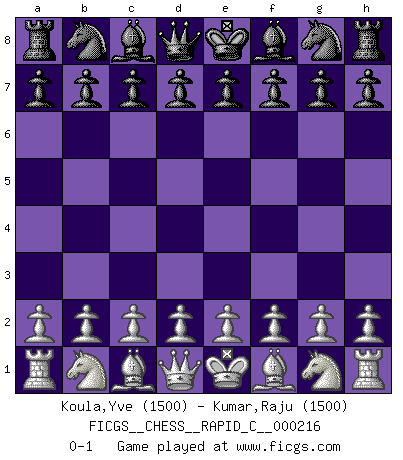 Last move : 0-1 2019 August 19 10:45:47 [Event "FICGS__CHESS__RAPID_C__000216"] [Site "FICGS"] [Date "2019.07.19"] [Round "1"] [White "Koula,Yve"] [Black "Kumar,Raju"] [Result "0-1"] [WhiteElo "1500"] [BlackElo "1500"] 0-1 This chess game has been lost on time (started : 2019.07.19 22:38:51) Player Black won this chess game. Follow this game move after move (download)The passed pawn is a criminal, who should be kept under lock and key. Mild measures, such as police surveillance, are not sufficient. (Nimzovitch) Smyslow ist ein Beweis dafür, dass ich noch zehn Jahre spielen kann! [der 75 jährige über den 85 jährigen] (Viktor Kortschnoi) Fischer deseaba darle a los Rusos una sopa de su propia medicina. (Larry Evans) Si je n'étais pas joueur d'échecs, je serais le meilleur dans quelque chose d'autre. (Anatoli Karpov) Information on the Internet is subject to the same rules and regulations as conversation at a bar. (George Lundberg)