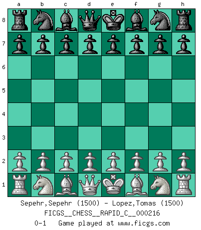 Last move : 0-1 2019 August 19 10:45:47 [Event "FICGS__CHESS__RAPID_C__000216"] [Site "FICGS"] [Date "2019.07.19"] [Round "1"] [White "Sepehr,Sepehr"] [Black "Lopez,Tomas"] [Result "0-1"] [WhiteElo "1500"] [BlackElo "1500"] 0-1 This chess game has been lost on time (started : 2019.07.19 22:38:51) Player Black won this chess game. Follow this game move after move (download)Many have become Chess Masters, no one has become the Master of Chess. (Siegbert Tarrasch) Ein Remis kann durch Wiederholung von drei Zügen oder durch einen schlechte Zug erreicht werden. (Savielly Grigorievitsch Tartakower) El estómago es una parte esencial del maestro de Ajedrez. (Bent Larsen) D'abord les bases : Jouez et étudiez, puis étudiez et jouez, ensuite jouez et étudiez, puis étudiez et jouez. Deuxièmement : Donnez toujours le meilleur de vous-même ! (Ken Smith) Computers are like Old Testament gods; lots of rules and no mercy. (Joseph Campbell)