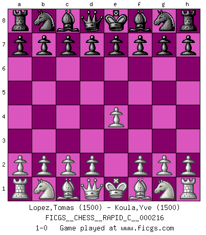 Last move : 1-0 2019 August 19 22:56:23 [Event "FICGS__CHESS__RAPID_C__000216"] [Site "FICGS"] [Date "2019.07.19"] [Round "1"] [White "Lopez,Tomas"] [Black "Koula,Yve"] [Result "1-0"] [WhiteElo "1500"] [BlackElo "1500"] 1.e4 1-0 This chess game has been lost on time (started : 2019.07.19 22:38:51) King's pawn Opening Player White won this chess game. Follow this game move after move (download)A good player is always lucky. (Jose Raul Capablanca) Ein Schachgenie ist jemand der verdammt gut Schach spielt. (Jonathan Levitt) Por tratar de evitar la pérdida de una pieza, muchas personas han perdido una partida de Ajedrez. (Savielly Tartakover) Le pion, dans sa simplicité, marche droit devant lui, mais lorsqu'il prend, il le fait obliquement? Ainsi l'homme, tant qu'il reste pauvre, marche dans la droiture et vit honnêtement, mais lorsqu'il recherche les honneurs, il flatte, se parjure et, par les voies obliques, cherche une position supérieure sur l'échiquier du monde. (Jean de Galles) Difficult things take a long time, impossible things a little longer. (Author unknown)