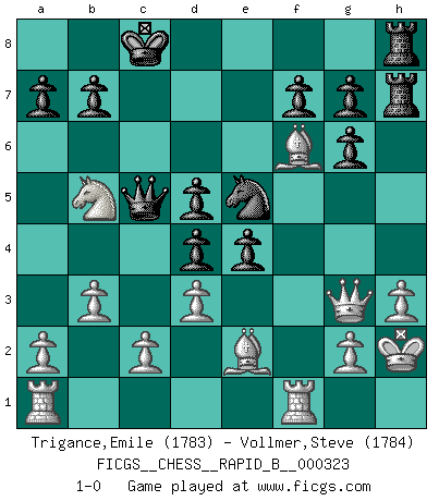 Last move : 1-0 2019 August 3 15:10:28 [Event "FICGS__CHESS__RAPID_B__000323"] [Site "FICGS"] [Date "2019.07.25"] [Round "1"] [White "Trigance,Emile"] [Black "Vollmer,Steve"] [Result "1-0"] [WhiteElo "1783"] [BlackElo "1784"] 1.b3 d5 2.Bb2 Bf5 3.f4 Nf6 4.Nf3 e6 5.e3 Bc5 6.Nd4 Bg6 7.Be2 Nbd7 8.O-O Qe7 9.d3 e5 10.f5 Bxd4 11.exd4 e4 12.fxg6 hxg6 13.Qe1 O-O-O 14.Qg3 Rh6 15.Bc1 Rh7 16.Bg5 Rdh8 17.h3 c5 18.Nc3 cxd4 19.Nb5 Ne5 20.Kh2 Qc5 21.Bxf6 1-0 Nimzovich-Larsen attack : Classical variation Kingside Castling by player White (move 8) Queenside Castling by player Black (move 13) Player White won this chess game. Follow this game move after move (download)Becoming successful at Chess allows you to discover your own personality. That's what I want for the kids I teach. (Saudin Robovic) Intelligenz läßt sich nicht am Weg, sondern nur am Ergebnis feststellen. (Garry Kasparov) Las piezas de Ajedrez son los bloques del alfabeto que moldean los pensamientos; y esos pensamientos, aunque hagan un diseño visual en el tablero, expresan abstractamente su belleza como un poema. (Marcel Duchamp) Si rien de grave n'est détecté lors de l'analyse d'une position, on joue alors le coup. Seconde règle de Blumenfeld. Unless I accept my faults I will most certainly doubt my virtues. (Hugh Prather)