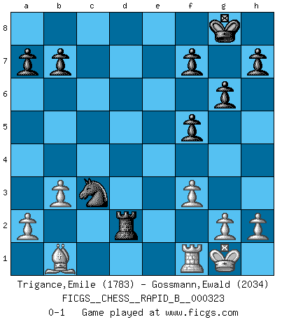 Last move : 0-1 2019 August 17 11:22:23 [Event "FICGS__CHESS__RAPID_B__000323"] [Site "FICGS"] [Date "2019.07.25"] [Round "1"] [White "Trigance,Emile"] [Black "Gossmann,Ewald"] [Result "0-1"] [WhiteElo "1783"] [BlackElo "2034"] 1.b3 d5 2.Bb2 Nf6 3.e3 Bf5 4.Nf3 e6 5.Be2 c5 6.O-O Be7 7.Nh4 O-O 8.Nxf5 exf5 9.d3 Nc6 10.Nd2 Qc7 11.Nf3 Rad8 12.d4 Ne4 13.c4 cxd4 14.Nxd4 dxc4 15.Bxc4 Bf6 16.Qe2 Nxd4 17.exd4 Bxd4 18.Rac1 Bxb2 19.Qxb2 Rd2 20.Rc2 Rfd8 21.Bd3 Rxc2 22.Qxc2 Qxc2 23.Bxc2 g6 24.f3 Nc3 25.Bb1 Rd2 0-1 Nimzovich-Larsen attack : Classical variation Kingside Castling by player White (move 6) Kingside Castling by player Black (move 7) Player Black won this chess game. Follow this game move after move (download)Chess is everything: art, science and sport. (Anatoly Karpov) Ich war schon mal beim Dopingtest. Da musste ich Urin abgeben, während Dritte zusahen. (Elisabeth Pähtz) Bobby es la celebridad menos entendida y malinterpretada que camina el la faz de esta tierra. (Yasser Seirawan) La menace est plus forte que l'exécution. (Aaron Nimzovitch) Creativity involves breaking out of established patterns in order to look at things in a different way. (Edward De Bono)