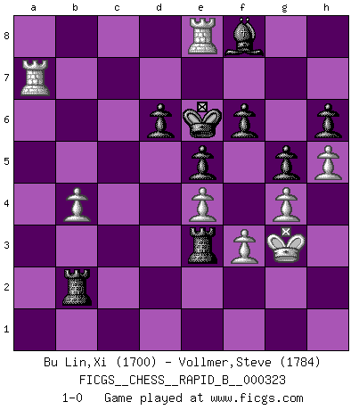 Last move : 1-0 2019 August 19 11:3:59 [Event "FICGS__CHESS__RAPID_B__000323"] [Site "FICGS"] [Date "2019.07.25"] [Round "1"] [White "Bu Lin,Xi"] [Black "Vollmer,Steve"] [Result "1-0"] [WhiteElo "1700"] [BlackElo "1784"] 1.e4 c5 2.Nf3 d6 3.d4 cxd4 4.Qxd4 Nc6 5.Qd1 Nf6 6.Nc3 g6 7.Bd3 Bg7 8.Bf4 O-O 9.O-O a6 10.Qd2 Bg4 11.Be2 Rc8 12.h3 Bd7 13.a3 Qc7 14.Bg5 Be6 15.Nd4 Nxd4 16.Qxd4 Bc4 17.Qxc4 Qxc4 18.Bxc4 Rxc4 19.Rfe1 h6 20.Bd2 e5 21.Rad1 Rfc8 22.f3 Bf8 23.Be3 Kg7 24.g4 b5 25.h4 Nd7 26.Re2 f6 27.h5 g5 28.R1d2 b4 29.axb4 Rxb4 30.Nd1 Nb6 31.Bxb6 Rxb6 32.b3 Kf7 33.Ne3 Ke6 34.Kf2 Rbc6 35.Re1 Rb8 36.Ra1 Rb5 37.Rd5 Rb8 38.Rda5 Ra8 39.b4 Rb8 40.Nd5 Rxc2+ 41.Kg3 Rbc8 42.Rxa6 Rb2 43.Ra8 R8c2 44.Ne3 Re2 45.R1a7 Rxe3 46.Re8+ 1-0 Sicilian, Chekhover variation Kingside Castling by player Black (move 8) Kingside Castling by player White (move 9) Player White won this chess game. Follow this game move after move (download)Chess is imagination. (David Bronstein) Sicherlich können nur Meister einen Stil haben. Daß ein nicht-Meister auch nur ein einziges Mal in seinem Leben eine Partie folgerecht durchführte, habe ich niemals bemerkt. (Emanuel Lasker) Bobby Fischer es el mas grande genio de Ajedrez de todos los tiempos. (Alexander Kotov) Les réformistes prétendent que les progrès de la théorie conduiront à la disparition des échecs, et qu'il faut, pour leur rendre vie, en remanier les règles. En réalité, qu'exprime cette affirmation? Le mépris de l'intuition, de l'imagination et de tous les autres éléments qui font des échecs un art. (Alexander Alekhine) The only thing that overcomes hard luck is hard work. (Harry Golden)