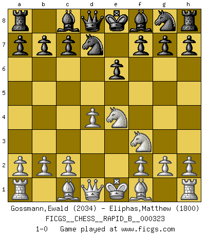 Last move : 1-0 2019 August 29 3:13:58 [Event "FICGS__CHESS__RAPID_B__000323"] [Site "FICGS"] [Date "2019.07.25"] [Round "1"] [White "Gossmann,Ewald"] [Black "Eliphas,Matthew"] [Result "1-0"] [WhiteElo "2034"] [BlackElo "1800"] 1.e4 e6 2.d4 d5 3.Nc3 dxe4 4.Nxe4 Nd7 5.Nf3 1-0 This chess game has been lost on time (started : 2019.07.25 12:45:23) French : Rubinstein variation Player White won this chess game. Follow this game move after move (download)Examine moves that smite! A good eye for smites is far more important than a knowledge of strategical principles. (Purdy) Ich bin es gewohnt, das die Jugend mir überhaupt keinen Respekt entgegenbringt. (Alexander Morozewich) Una compensación adecuada por un sacrificio es tener una combinación sólida que conduce a una posición ganadora; una compensación adecuada por una metida de pata es dejar a tu oponente arrebatar una derrota de las fauces de la victoria. (Bruce A. Moon) La tactique, c'est ce que vous faites quand il y a quelque chose à faire; la stratégie, c'est ce que vous faites quand il n'y a rien à faire. (Savielli Tartacower) Life is like a game of cards: the hand you are dealt represents determinism; the way you play it is free will. (Jawaharlal Nehru)