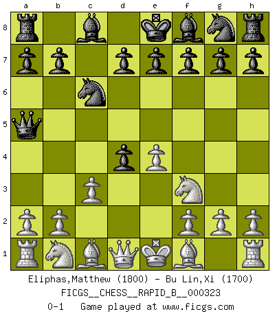 Last move : 0-1 2019 August 29 15:26:18 [Event "FICGS__CHESS__RAPID_B__000323"] [Site "FICGS"] [Date "2019.07.25"] [Round "1"] [White "Eliphas,Matthew"] [Black "Bu Lin,Xi"] [Result "0-1"] [WhiteElo "1800"] [BlackElo "1700"] 1.e4 c5 2.Nf3 Nc6 3.d4 Qa5+ 4.c3 cxd4 0-1 This chess game has been lost on time (started : 2019.07.25 12:45:23) Sicilian defense Player Black won this chess game. Follow this game move after move (download)The winner of the game is the player who makes the next-to-last mistake. (Savielly Tartakover) Mit Schach schule ich mein Gefühl für Geometrie, was für Tennis und Schach gleichermaßen wichtig ist. (Boris Becker) Combinaciones deslumbrantes son para la mayoría, mover madera es para los pocos. (Georg Kieninger) On n'a jamais que l'âge auquel on a commence à jouer aux échecs car après on cesse de vieillir. (Capablanca) May the force be with you. (Han Solo in Star Wars ep.4)
