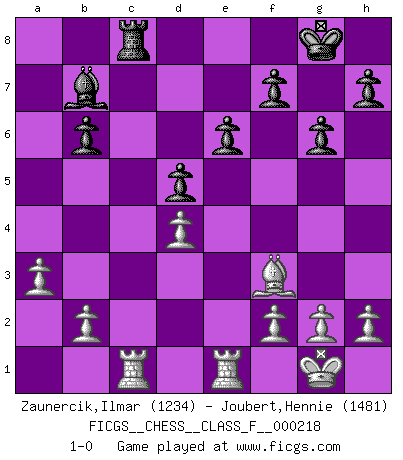 Last move : 1-0 2019 August 15 14:55:21 [Event "FICGS__CHESS__CLASS_F__000218"] [Site "FICGS"] [Date "2019.07.30"] [Round "1"] [White "Zaunercik,Ilmar"] [Black "Joubert,Hennie"] [Result "1-0"] [WhiteElo "1234"] [BlackElo "1481"] 1.e4 c5 2.Nf3 e6 3.d4 cxd4 4.Nxd4 Nf6 5.Nc3 Qb6 6.a3 Bc5 7.Na4 Qa5+ 8.Nc3 Nxe4 9.Nb3 Qb6 10.Nxe4 Be7 11.Be3 Qc7 12.Be2 Nc6 13.O-O O-O 14.Re1 d5 15.Ng3 b6 16.Nd4 Bb7 17.Nxc6 Qxc6 18.Bf3 Rac8 19.c3 Qc7 20.Qa4 Bf6 21.Qxa7 Bd8 22.Qa4 Ra8 23.Qg4 Bf6 24.Nh5 Qe7 25.Bh6 g6 26.Bxf8 Rxf8 27.Nxf6+ Qxf6 28.Qd4 Qxd4 29.cxd4 Rc8 30.Rac1 1-0 Sicilian : Anderssen variation Kingside Castling by player White (move 13) Kingside Castling by player Black (move 13) Player White won this chess game. Follow this game move after move (download)No price is too great for the scalp of the enemy King. (Koblentz) Zu meiner Zeit war ein 20 jähriger ein junger Spieler, heute ist er ein Veteran. (Garry Kasparov) Las Aperturas te enseñan aperturas. ¡Los Finales te enseñan Ajedrez!. (Stephan Gerzadowicz) Le jeu d'échecs fait naître et fortifie en nous plusieurs qualités précieuses dans le cours de l'existence, telles que la prévoyance, la circonspection, la prudence, et la persévérance. (Benjamin Franklin - 1783, la morale des échecs) The ultimate in disposing one's troops is to be without ascertainable shape. Then the most penetrating spies cannot pry in nor can the wise lay plans against you. (Sun Tzu)