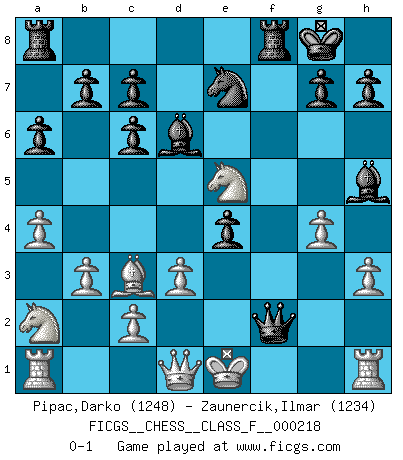 Last move : 0-1 2019 August 5 16:17:52 [Event "FICGS__CHESS__CLASS_F__000218"] [Site "FICGS"] [Date "2019.07.30"] [Round "1"] [White "Pipac,Darko"] [Black "Zaunercik,Ilmar"] [Result "0-1"] [WhiteElo "1248"] [BlackElo "1234"] 1.e4 e5 2.Nf3 Nc6 3.Bb5 a6 4.Bxc6 dxc6 5.Nc3 Bd6 6.d3 Bg4 7.h3 Bh5 8.Bg5 Qd7 9.b3 f6 10.Bd2 Ne7 11.a4 O-O 12.Na2 f5 13.Bc3 fxe4 14.Nxe5 Qf5 15.g4 Qxf2+ 0-1 Ruy Lopez : Exchange, Keres variation Kingside Castling by player Black (move 11) Player Black won this chess game. Follow this game move after move (download)Look at Garry Kasparov. After he loses, invariably he wins the next game. He just kills the next guy. That's something that we have to learn to be able to do. (Maurice Ashley) Drei Punkte vor allen anderen ist wie einer, der im weißen Anzug posiert, während der Rest in Müllsäcke gekleidet dasteht. (Viktor Kortschnoi) En un gambito tu regalas un Peón por el bién de tomar un juego perdido. (Samuel Standige Boden) Horreur, mais aussi harmonie suprême : qu'y avait-il en effet au monde en dehors des échecs ? Le brouillard, l'inconnu, le non-être... (Vladimir Nabokov) At last I discovered the true beauty of chess. So I proposed to her. (Dinesh De Silva)