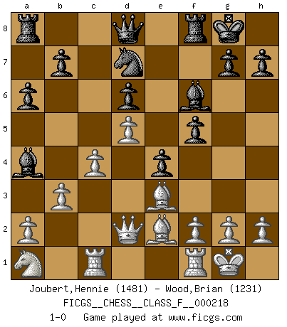 Last move : 1-0 2019 September 8 7:53:42 [Event "FICGS__CHESS__CLASS_F__000218"] [Site "FICGS"] [Date "2019.07.30"] [Round "1"] [White "Joubert,Hennie"] [Black "Wood,Brian"] [Result "1-0"] [WhiteElo "1481"] [BlackElo "1231"] 1.e4 c5 2.Nf3 d6 3.d4 cxd4 4.Nxd4 Nf6 5.Nc3 a6 6.Be3 e5 7.Nb3 Be6 8.Nd5 Nxd5 9.exd5 Bd7 10.Be2 Be7 11.O-O O-O 12.c4 Ba4 13.Qd3 f5 14.Rac1 Nd7 15.Na1 e4 16.Qd2 Bf6 17.b3 1-0 Sicilian : Najdorf, Byrne (English) attack Kingside Castling by player White (move 11) Kingside Castling by player Black (move 11) Player White won this chess game. Follow this game move after move (download)What is the difference between chess and football? Everybody understands football, but nobody plays it. Everybody plays chess, but nobody understands it. Everything is relative. (Vladimir Kramnik) Mutter, ich bin eben Ex-Weltmeister geworden. --beim nach Hause Kommen nach dem Verlust des WM-Titels an Mihail Botvinnik -- (Mikhail Nekhemyevich Tal) Cuando estes solo, cuando te sientas un extraño en el mundo, juega al Ajedrez. Esto levantará tu espiritu y será tu consejero de guerra. (Aristóteles) Avant la finale, les dieux ont créé le milieu de partie. (Tarrasch) Crush them ! Make them suffer ! (General Grievous in Star Wars ep.3)