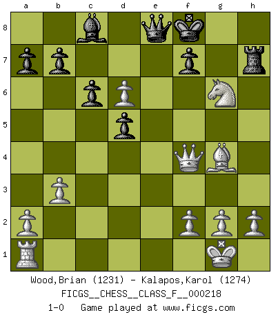 Last move : 1-0 2019 October 6 14:16:35 [Event "FICGS__CHESS__CLASS_F__000218"] [Site "FICGS"] [Date "2019.07.30"] [Round "1"] [White "Wood,Brian"] [Black "Kalapos,Karol"] [Result "1-0"] [WhiteElo "1231"] [BlackElo "1274"] 1.Nf3 Nf6 2.c4 e6 3.d4 g6 4.Nc3 Bg7 5.e4 d6 6.Be2 Nbd7 7.O-O O-O 8.Bg5 c6 9.e5 dxe5 10.dxe5 h6 11.exf6 hxg5 12.fxg7 Kxg7 13.Ne4 g4 14.Nfg5 Qe7 15.Bxg4 Ne5 16.Be2 Rd8 17.Qc2 Rh8 18.Nf3 Nd7 19.Rfd1 Nb6 20.Qc3+ Kf8 21.b3 Rh5 22.Ng3 Rh7 23.Ne4 Bd7 24.c5 Nd5 25.Qd3 Rd8 26.Ne5 Bc8 27.Nd6 Nf4 28.Qe3 Nd5 29.Rxd5 exd5 30.Qf4 Rxd6 31.cxd6 Qe6 32.Bg4 Qe8 33.Nxg6+ 1-0 Reti Opening Kingside Castling by player White (move 7) Kingside Castling by player Black (move 7) Player White won this chess game. Follow this game move after move (download)Chess is a terrible game. If you have no center, your opponent has a freer position. If you do have a center, then you really have something to worry about ! (Siegbert Tarrasch) Die Jungen erwarten, dass Opa einfach umfällt. Dann aber kann Opa fünf Stunden lang Schach spielen und die jungen Gegner an die Wand drücken. (Viktor Kortschnoi) Los libros de Ajedrez deben de usarse igual como usamos los anteojos: para mejorar la vista, aunque algunos jugadores los quieren usar como si ellos les otorgaran la vision. (José Raúl Capablanca) Le temps de noter son nom sur la feuille de partie, j'étais déjà en zeitnot ! D'un modeste amateur apparié lors de la première ronde d'un open contre le grand-maître Azmaïparashvili. I have opinions of my own - strong opinions - but I don't always agree with them. (George Bush)