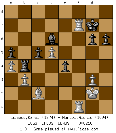 Last move : 1-0 2019 September 17 10:39:42 [Event "FICGS__CHESS__CLASS_F__000218"] [Site "FICGS"] [Date "2019.07.30"] [Round "1"] [White "Kalapos,Karol"] [Black "Marcel,Alexis"] [Result "1-0"] [WhiteElo "1274"] [BlackElo "1094"] 1.d4 f5 2.c4 Nf6 3.Nc3 g6 4.Bg5 Bg7 5.e3 O-O 6.Bd3 d6 7.Nge2 Nbd7 8.O-O a6 9.Nf4 Nb6 10.Qb3 c5 11.dxc5 dxc5 12.Rad1 Qc7 13.Kh1 e5 14.Bxf6 Bxf6 15.Nfd5 Nxd5 16.Nxd5 Qc6 17.Be2 Be6 18.Bf3 e4 19.Be2 Bxd5 20.cxd5 Qd6 21.Qxb7 Rfb8 22.Qc6 Be5 23.b3 a5 24.g3 Rc8 25.Qb7 Rcb8 26.Qc6 Ra6 27.Qxa6 Qxa6 28.Bxa6 Bd6 29.Bc4 Kg7 30.Kg2 h6 31.h4 Ra8 32.a4 Rb8 33.f4 exf3+ 34.Rxf3 Re8 35.Rdf1 Re7 36.Kh2 Re4 37.Bd3 Rb4 38.Bc2 Rxh4+ 39.Kg2 Rb4 40.e4 fxe4 41.Rf7+ 1-0 Dutch with c4 & Nc3 Kingside Castling by player Black (move 5) Kingside Castling by player White (move 8) Player White won this chess game. Follow this game move after move (download)Fischer is an American Chess tragedy on par with Morphy and Pillsbury. (Mig Greengard) Sie führen leise Selbstgespräche, schlürfen lautstark ihre Getränke, schmatzen hörbar beim Essen, blasen ihrem Gegenüber Rauch in die Augen, niesen ihm ins Gesicht, starren ihn unverwandt an, bis er sich unter ihren Blicken windet, rutschen ständig auf ihrem Stuhl hin und her, rülpsen und bohren in der Nase. (Anonymous) Tu no necesitas jugar muy bien, únicamente ayudar a tu oponenet a que juegue muy mal. (Genrikh Chepukaitis) C'est la seule position que je connaisse où les deux camps sont mals. Propos prêtés à V. Anand. Begin at the beginning and go on till you come to the end; then stop. (Lewis Carrol, Alice in Wonderland)