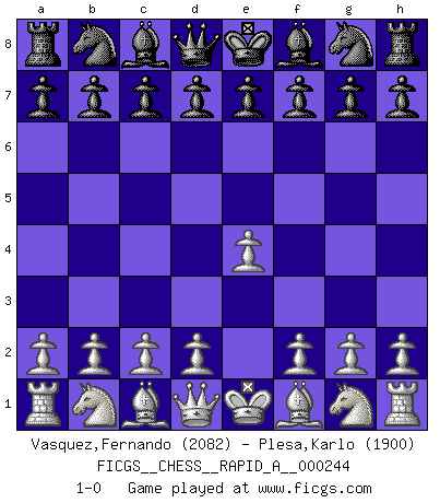 Last move : 1-0 2019 August 31 5:25:19 [Event "FICGS__CHESS__RAPID_A__000244"] [Site "FICGS"] [Date "2019.07.31"] [Round "1"] [White "Vasquez,Fernando"] [Black "Plesa,Karlo"] [Result "1-0"] [WhiteElo "2082"] [BlackElo "1900"] 1.e4 1-0 This chess game has been lost on time (started : 2019.07.31 20:5:35) King's pawn Opening Player White won this chess game. Follow this game move after move (download)Man is a frivolous, a specious creature, and like a Chess player, cares more for the process of attaining his goal than for the goal itself. (Dostoyevsky) Sehr viele beherrschen heutzutage das große Einmalseins des Schachspiels und kennen sogar dessen Logarithmentafeln auswendig - deshalb sollte man hin und wieder zu beweisen trachten, dass zwei mal zwei auch fünf sein kann. (Mikhail Nekhemyevich Tal) El Ajedrez es el arte del análisis. (Mikhail Botvinnik) A ce moment-là, je menaçais de comprendre la position ! (Clément L'Heureux) Knowledge will give you power, but character respect. (Bruce Lee)