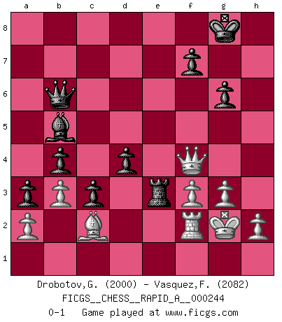 Last move : 0-1 2019 October 1 7:36:13 [Event "FICGS__CHESS__RAPID_A__000244"] [Site "FICGS"] [Date "2019.07.31"] [Round "1"] [White "Drobotov,Gennady"] [Black "Vasquez,Fernando"] [Result "0-1"] [WhiteElo "2000"] [BlackElo "2082"] 1.d4 Nf6 2.Nf3 e6 3.c4 b6 4.e3 Bb7 5.Be2 d5 6.O-O Bd6 7.cxd5 exd5 8.Nc3 O-O 9.Nb5 Be7 10.Nc3 Re8 11.Ne5 c5 12.Bb5 Rf8 13.Qf3 a6 14.Bd3 Nc6 15.Bd2 Re8 16.Qh3 g6 17.Nxc6 Bxc6 18.f3 c4 19.Bc2 b5 20.Ne2 b4 21.Qg3 Rb8 22.Rac1 a5 23.Qf2 Bd6 24.Rce1 Rb7 25.Ng3 Bb5 26.Ne2 a4 27.Qh4 a3 28.b3 c3 29.Bc1 Qb6 30.Rf2 Be7 31.Qh3 h5 32.Nf4 Bd7 33.Qg3 h4 34.Qg5 Nh5 35.Qh6 Nxf4 36.Qxf4 Bf6 37.Qh6 Bxd4 38.g3 Bb5 39.Qxh4 Rbe7 40.Kg2 Bxe3 41.Bxe3 Rxe3 42.Rxe3 Rxe3 43.Qf4 d4 0-1 Queen's pawn game Kingside Castling by player White (move 6) Kingside Castling by player Black (move 8) Player Black won this chess game. Follow this game move after move (download)The combination player thinks forward; he starts from the given position, and tries the forceful moves in his mind. (Emanuel Lasker) Ich verachte die Medien. (Robert James Fischer) Estaba muy claro de que el punto vulnerable del Gran Maestro Americano (Bobby Fischer) radicaba en las posiciones de doble filo, colgantes, irracionales, donde el siempre falló en encontrar un triunfo aún en una posición de clara victoria. (Efim Geller) La guerre est enfant de la passion, la passion est enfant du narcissisme et le narcissisme est l'enfant. (...) Une autre partie ? (Thibault de Vassal) The arrogant army will lose certainly the battle. (Chinese proverb)