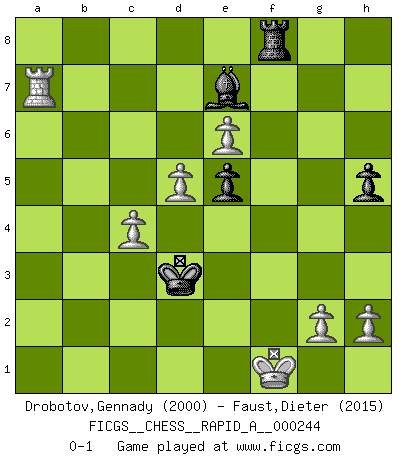Last move : 0-1 2019 September 22 16:29:15 [Event "FICGS__CHESS__RAPID_A__000244"] [Site "FICGS"] [Date "2019.07.31"] [Round "1"] [White "Drobotov,Gennady"] [Black "Faust,Dieter"] [Result "0-1"] [WhiteElo "2000"] [BlackElo "2015"] 1.d4 c6 2.e4 d5 3.e5 Bf5 4.Bd3 Bxd3 5.Qxd3 e6 6.Nf3 c5 7.O-O c4 8.Qd1 Nc6 9.Nc3 Bb4 10.Ne2 Nge7 11.c3 Ba5 12.b4 Bc7 13.b5 Nb8 14.Nf4 a6 15.Rb1 axb5 16.Rxb5 b6 17.Qc2 h5 18.a4 Nbc6 19.Ba3 Qd7 20.Re1 Na7 21.Rb2 Nac8 22.Ra1 Qxa4 23.Qd2 Qd7 24.Rba2 Nf5 25.Bb4 Rxa2 26.Qxa2 Nce7 27.Qa8+ Qc8 28.Bxe7 Nxe7 29.Qa4+ Qd7 30.Qb4 Bd8 31.Ra8 Qb7 32.Ra1 g5 33.Ne2 Nc6 34.Qb5 Kd7 35.Nd2 Kc7 36.f4 gxf4 37.Rf1 Be7 38.Nxf4 Qa7 39.Nxd5+ exd5 40.Qxd5 Qa5 41.Qxa5 bxa5 42.Nxc4 Rf8 43.Ra1 f6 44.e6 Rb8 45.d5 Ne5 46.Nxe5 fxe5 47.Rxa5 Kb6 48.Ra4 Kc5 49.c4 Kd4 50.Kf1 Kd3 51.Ra7 Rf8+ 0-1 Queen's pawn Kingside Castling by player White (move 7) Player Black won this chess game. Follow this game move after move (download)I don't believe in psychology. I believe in good moves. (Bobby Fischer) Glücklicherweise sind Großmeister Ruben Fines reine Schachbücher weniger phallozentrisch [als seine Schachpsychologie] und deswegen auch weniger lächerlich. (Nigel Short) El Ajedrez tiene tanto misterio como las mujeres. (Purdy) Le profane ne songe pas à la somme de jouissance dont il se prive, qui méconnaît ce jeu aux ressources aussi variées que passionnantes. (Jean-Marie Jeanton-Lamarche) We need strong personalities and only one world champion to attract sponsors. (Anatoly Karpov)