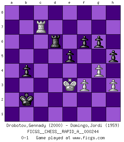 Last move : 0-1 2019 September 14 9:26:52 [Event "FICGS__CHESS__RAPID_A__000244"] [Site "FICGS"] [Date "2019.07.31"] [Round "1"] [White "Drobotov,Gennady"] [Black "Domingo,Jordi"] [Result "0-1"] [WhiteElo "2000"] [BlackElo "1959"] 1.d4 d5 2.c4 dxc4 3.Nf3 c5 4.e3 Nf6 5.Bxc4 e6 6.O-O a6 7.Nc3 b5 8.Bd3 Bb7 9.Qe2 Nbd7 10.Bc2 Qc7 11.Rd1 Rd8 12.d5 Nxd5 13.Nxd5 Bxd5 14.a4 Bc4 15.Qe1 Be7 16.axb5 Bxb5 17.Bd2 O-O 18.Bc3 Nb6 19.Be5 Qc6 20.Rxd8 Rxd8 21.Qb1 g6 22.e4 f6 23.Bc3 e5 24.Ba5 Kg7 25.Qc1 Rd7 26.Bc3 c4 27.Qe1 Bd6 28.Bb4 Na4 29.Bxd6 Rxd6 30.Bxa4 Bxa4 31.Qc3 Qxe4 32.Qb4 Qc6 33.h3 Bb5 34.Nd2 c3 35.bxc3 Rxd2 36.c4 Qd6 37.Qxd6 Rxd6 38.cxb5 axb5 39.Rb1 Rb6 40.Rb4 Kf7 41.Kf1 Ke6 42.Ke1 Kd5 43.Kd2 Kc5 44.Rb2 Rd6+ 45.Ke3 b4 46.f3 Kc4 47.Rc2+ Kb3 48.Rc7 h5 49.g4 Kb2 0-1 QGA : 3.Nf3 Kingside Castling by player White (move 6) Kingside Castling by player Black (move 17) Player Black won this chess game. Follow this game move after move (download)He who fears an isolated Queen's Pawn should give up Chess. (Siegbert Tarrasch) Um sich vor der Gefahr einer Erkältung zu schützen, sorge der wanderlustige König beizeiten für ein brauchbares Versteck. (Aaron Nimzowitsch) El ganador de una partida es aquel jugador que hace el penúltimo error. (Savielly Tartakover) Le système Elo représente seulement une moyenne. Il est simplement un indicateur de votre stabilité. (Anatoli Karpov) Opportunities multiply as they are seized. (Sun Tzu)