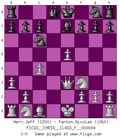 Last move : 1-0 2006 August 8 16:21:13 [Event "FICGS__CHESS__CLASS_F__000004"] [Site "FICGS"] [Date "2006.06.18"] [Round "1"] [White "Herr,Jeff"] [Black "Fanton,Nicolas"] [Result "1-0"] [WhiteElo "1200"] [BlackElo "1360"] 1.d4 d5 2.c4 e5 3.dxe5 d4 4.a3 Nc6 5.e3 Bf5 6.Bd3 Bxd3 7.Qxd3 dxe3 8.Qxe3 Be7 9.Nf3 1-0 This chess game has been lost on time (started : 2006.06.18 21:18:40) QGD : Albin counter-gambit Player White won this chess game. Follow this game move after move (download)A bad day of Chess is better than any good day at work. (Anonymous) Bis jetzt ist Weiß einer wohlbekannten Analyse gefolgt. Aber jetzt begeht er einen schrecklichen Fehler: Er beginnt seinen eigenen Kopf zu benutzen. (Siegbert Tarrasch) El Ajedrez es el arte del análisis. (Mikhail Botvinnik) La guerre est enfant de la passion, la passion est enfant du narcissisme et le narcissisme est l'enfant. (...) Une autre partie ? (Thibault de Vassal) Lottery : A tax on people who are bad at math. (Author unknown)