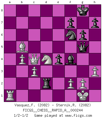 Last move : 1/2-1/2 2019 November 4 11:7:17 [Event "FICGS__CHESS__RAPID_A__000244"] [Site "FICGS"] [Date "2019.07.31"] [Round "1"] [White "Vasquez,Fernando"] [Black "Sternik,Ryszard"] [Result "1/2-1/2"] [WhiteElo "2082"] [BlackElo "2082"] 1.e4 c5 2.c3 d5 3.exd5 Qxd5 4.d4 Nf6 5.Nf3 e6 6.Na3 a6 7.Nc4 Nbd7 8.Be2 b5 9.Ne3 Qc6 10.O-O Be7 11.a4 Bb7 12.dxc5 Qxc5 13.axb5 axb5 14.Rxa8+ Bxa8 15.Nc2 O-O 16.Be3 Qc7 17.Nfd4 Nd5 18.Bxb5 N7f6 19.Qe2 Nxe3 20.Nxe3 Rb8 21.Ra1 Bc5 22.Bd3 Bd6 23.h3 Bh2+ 24.Kh1 Bf4 25.Nb5 Qe5 26.Nc2 Qc5 27.Kg1 g6 28.b4 Qc6 29.Ne1 e5 30.Rd1 Qb6 31.Nc2 Bc6 32.Nba3 Ba4 33.Bc4 Rc8 34.Ra1 Bxc2 35.Nxc2 Qc7 36.Ba6 Rd8 37.Qc4 Qd7 38.Bb5 Qf5 39.Ne1 e4 40.Nc2 Rd2 41.Nd4 Qg5 1/2-1/2 Sicilian : Alapin's variation (2.c3) Kingside Castling by player White (move 10) Kingside Castling by player Black (move 15) This chess game ended in a draw. Follow this game move after move (download)Many have become Chess Masters, no one has become the Master of Chess. (Siegbert Tarrasch) Pläne sind die Träume des Verständigen. (Ernst Freiherr von Feuchtersleben) Haz el enroque temprano y seguido. (Rob Sillars) Le temps de noter son nom sur la feuille de partie, j'étais déjà en zeitnot ! D'un modeste amateur apparié lors de la première ronde d'un open contre le grand-maître Azmaïparashvili. Mandala - that's it! 16x16 squares as multiple of the four and the eight because of the Four Noble Truths and the Noble Eightfold Path. (Heinz-Georg Lehnhoff about Big Chess)