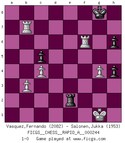 Last move : 1-0 2019 November 28 6:51:54 [Event "FICGS__CHESS__RAPID_A__000244"] [Site "FICGS"] [Date "2019.07.31"] [Round "1"] [White "Vasquez,Fernando"] [Black "Salonen,Jukka"] [Result "1-0"] [WhiteElo "2082"] [BlackElo "1953"] 1.e4 e5 2.Nf3 Nc6 3.d4 exd4 4.Nxd4 Nf6 5.Nxc6 bxc6 6.e5 Qe7 7.Qe2 Nd5 8.c4 Ba6 9.b3 g6 10.f4 d6 11.Qd2 Nb6 12.Ba3 c5 13.Nc3 dxe5 14.O-O-O Bb7 15.Qf2 e4 16.Qe3 a5 17.Nb5 a4 18.f5 f6 19.Qf4 Kf7 20.Bb2 Rc8 21.Be2 Bg7 22.Bg4 g5 23.Bh5+ Kg8 24.Qg3 Bh6 25.Ba3 Bf8 26.Rhe1 Qg7 27.Bb2 h6 28.Qc3 Rh7 29.Bg6 Nd7 30.Qd2 Ne5 31.Bxh7+ Qxh7 32.Bxe5 fxe5 33.g4 axb3 34.axb3 Ra8 35.Nc3 Qf7 36.Nxe4 Bxe4 37.Rxe4 Bd6 38.Kb2 Be7 39.h4 Rf8 40.Qa5 gxh4 41.Qxc7 Qf6 42.Kc2 Ra8 43.Qxe5 Qxe5 44.Rxe5 Ra2+ 45.Kd3 Bf8 46.Rd2 Ra7 47.Ke2 Be7 48.Rd3 Kf8 49.Re6 Kg7 50.Kf3 Rc7 51.Rg6+ Kh7 52.Kf2 Bf8 53.Kg2 Be7 54.Kh3 Bg5 55.Rgd6 Rc8 56.Rd7+ Kg8 57.Ra7 Re8 58.Rc7 Re5 59.Rc8+ Kf7 60.Rd7+ Be7 61.Rc6 Re3+ 62.Kh2 Re2+ 63.Kg1 Ke8 64.Ra7 Bg5 65.f6 Kf8 66.Rh7 Bxf6 67.Rxf6+ Kg8 68.Rb7 1-0 Scotch : Mieses variation Queenside Castling by player White (move 14) Player White won this chess game. Follow this game move after move (download)Chess demands total concentration. (Bobby Fischer) Als ich elf wurde, wurde ich einfach gut. (Robert James Fischer) La última cosa en que Fischer estaba interesado era en tonterías, siempre y cuando el Ajedrez estuviera involucrado. (Elie Agur) J'ai toujours senti une vague pitié pour l'homme qui ne connaît rien aux échecs, tout comme j'en aurais pour un homme ignorant de l'amour. Les Echecs, comme la musique ou comme l'amour, ont le pouvoir de rendre heureux. (Siegbert Tarrasch) They say in chess you've got to kill the queen, and then you mate it... Oh I, do you ? (Red Hot Chili Peppers, Fortune faded)