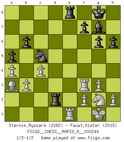 Last move : 1/2-1/2 2019 September 13 15:38:47 [Event "FICGS__CHESS__RAPID_A__000244"] [Site "FICGS"] [Date "2019.07.31"] [Round "1"] [White "Sternik,Ryszard"] [Black "Faust,Dieter"] [Result "1/2-1/2"] [WhiteElo "2082"] [BlackElo "2015"] 1.e4 c6 2.Nc3 d5 3.d4 dxe4 4.Nxe4 Bf5 5.Ng3 Bg6 6.Nf3 e6 7.Bd3 Nf6 8.O-O Nbd7 9.Re1 Bd6 10.c4 Bxd3 11.Qxd3 O-O 12.b3 Qc7 13.Ne4 Nxe4 14.Rxe4 Rfd8 15.Qe2 h6 16.Bd2 a5 17.a4 c5 18.Bc3 cxd4 19.Rxd4 Nc5 20.Rg4 e5 21.Nh4 Qd7 22.Qf3 Bf8 23.Bxe5 Qd3 24.Rg3 Qxf3 25.Rxf3 Rd7 26.g3 Rad8 27.Kg2 Re8 28.Bb2 g6 29.Ba3 Rd2 30.Kg1 b6 31.Ng2 Bg7 32.Re1 1/2-1/2 Caro-Kann defense Kingside Castling by player White (move 8) Kingside Castling by player Black (move 11) This chess game ended in a draw. Follow this game move after move (download)Life is a kind of Chess, with struggle, competition, good and ill events. (Benjamin Franklin) Je älter ich werde, um so mehr schätze ich die Bauern. (Paul Keres) Una de estas pequeñas movidas modestas pudieran ser mas molestas a tu oponente que la amenaza mas grande. (Siegbert Tarrasch) Les sacrifices démontrent seulement que quelqu'un a gaffé. (Savielly Tartacover) Rules and bones are meant to be broken. (Anonymous)