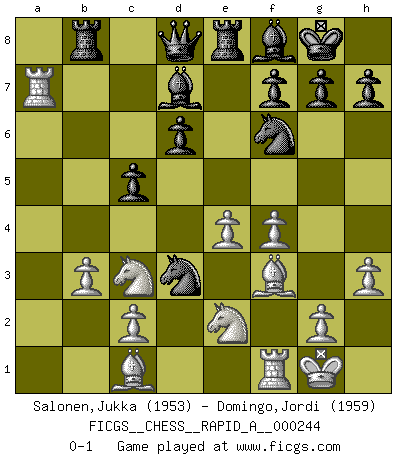 Last move : 0-1 2019 September 7 7:38:45 [Event "FICGS__CHESS__RAPID_A__000244"] [Site "FICGS"] [Date "2019.07.31"] [Round "1"] [White "Salonen,Jukka"] [Black "Domingo,Jordi"] [Result "0-1"] [WhiteElo "1953"] [BlackElo "1959"] 1.e4 e5 2.Nf3 d6 3.d4 exd4 4.Nxd4 Nf6 5.Nc3 Be7 6.Be2 O-O 7.O-O Re8 8.f4 Bf8 9.Bf3 c5 10.Nde2 Nc6 11.h3 Bd7 12.b3 Rb8 13.a3 b5 14.Qd3 b4 15.axb4 Nxb4 16.Rxa7 Nxd3 0-1 Philidor : Exchange variation Kingside Castling by player Black (move 6) Kingside Castling by player White (move 7) Player Black won this chess game. Follow this game move after move (download)Not all artists are Chess players, but all Chess players are artists. (Marcel Duchamp) Wer sich die Fähigkeit anerziehen will im Schach selbstständig zu denken, der muß alles meiden, was leblos ist: ausgeklügelte Theorien, die sich auf sehr wenige Beispiele und eine Menge Hirngespinste stützen. (Emanuel Lasker) Por esta medida (el intervalo entre Fischer y sus contemporaneos), yo le considero el mas grande campeón mundial. (Garry Kasparov) Aucun coup ne doit être joué sans but. (Pedro Damiano) A proverb is a short sentence based on long experience. (Miguel de Cervantes)