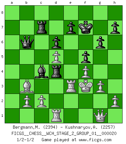 Last move : 1/2-1/2 2019 October 3 9:0:18 [Event "FICGS__CHESS__WCH_STAGE_2_GROUP_01__000020"] [Site "FICGS"] [Date "2019.08.03"] [Round "1"] [White "Bergmann,Michael"] [Black "Kushnaryov,Andrey"] [Result "1/2-1/2"] [WhiteElo "2394"] [BlackElo "2257"] 1.e4 c5 2.Nf3 Nc6 3.Nc3 g6 4.d4 cxd4 5.Nxd4 Bg7 6.Be3 Nf6 7.Bc4 O-O 8.Bb3 d6 9.f3 Bd7 10.Qd2 Rc8 11.O-O-O Nxd4 12.Bxd4 b5 13.Nd5 Nxd5 14.Bxg7 Kxg7 15.exd5 a5 16.a3 Kg8 17.Rhe1 Rc5 18.Re3 b4 19.axb4 axb4 20.Qxb4 Qa8 21.Kd2 Rb8 22.Qd4 Qa5+ 23.Ke2 Rb4 24.Qd2 Qb6 25.Ra1 Rc7 26.Kf1 Bb5+ 27.Kf2 Rd4 28.Qa5 Qc5 29.Qe1 f5 30.g3 Kf7 31.Rd1 Ba6 32.f4 Qb6 33.Kf3 Bc4 34.Qg1 1/2-1/2 Sicilian defense Kingside Castling by player Black (move 7) Queenside Castling by player White (move 11) This chess game ended in a draw. Follow this game move after move (download)Live, lose, and learn, by observing your opponent how to win. (Amber Steenbock) Alle offensichtlichen Züge sehen nach dem Spiel in der Analyse verdächtig aus. (Viktor Kortschnoi) Existen dos clases de sacrificios: los correctos y los míos. (Mikhail Tal) A ce moment-là, je menaçais de comprendre la position ! (Clément L'Heureux) Dave, my mind is going. I can feel it. (HAL 9000 in 2001, a space odyssey)