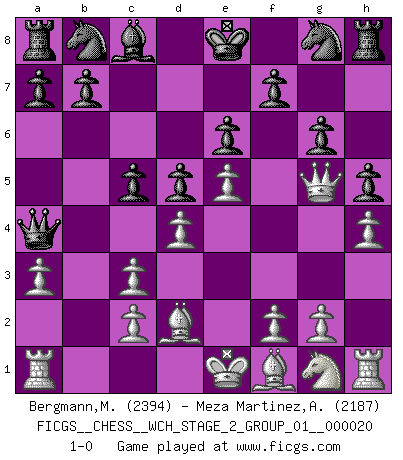 Last move : 1-0 2019 September 19 18:5:46 [Event "FICGS__CHESS__WCH_STAGE_2_GROUP_01__000020"] [Site "FICGS"] [Date "2019.08.03"] [Round "1"] [White "Bergmann,Michael"] [Black "Meza Martinez,Alcides Ivan"] [Result "1-0"] [WhiteElo "2394"] [BlackElo "2187"] 1.e4 e6 2.d4 d5 3.Nc3 Bb4 4.e5 c5 5.a3 Bxc3+ 6.bxc3 Qa5 7.Bd2 Qa4 8.Qg4 g6 9.h4 h5 10.Qg5 1-0 This chess game has been lost on time (started : 2019.08.03 0:16:12) French : Winawer, Advance variation Player White won this chess game. Follow this game move after move (download)There must have been a time when men were demigods, or they could not have invented Chess. (Gustav Schenk) Wer der Ansicht ist, daß alle Schachspieler verrückt sind, wird durch Studium des Lebens von Emil Josef Diemer nicht auf andere Gedanken kommen. (Hans Ree) El Ajedrez, como cualquier actividad creativa, solo puede existir a través del esfuerzo combinado de aquellos que tienen talento creativo y de aquellos que poseen la habilidad de organizar su trabajo creativo. (Mikhail Botvinnik) Vous m'avez demandé de vous exposer quel est le fondement de la prière. Je ne fais que préparer les pièces du jeu sur la table... Nous sera-t-il permis d'en adopter les règles et si nous les appliquons scrupuleusement nous ne tarderons pas à faire mat le Roi divin ! Il ne pourra échapper à nos mains. (Sainte Thérèse d'Avila, Chemin de perfection) A clear conscience is usually the sign of a bad memory. (Unknown)
