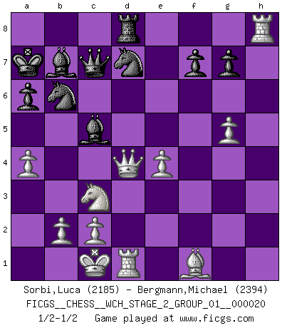 Last move : 1/2-1/2 2019 August 11 14:54:9 [Event "FICGS__CHESS__WCH_STAGE_2_GROUP_01__000020"] [Site "FICGS"] [Date "2019.08.03"] [Round "1"] [White "Sorbi,Luca"] [Black "Bergmann,Michael"] [Result "1/2-1/2"] [WhiteElo "2185"] [BlackElo "2394"] 1.e4 c5 2.Nf3 d6 3.d4 cxd4 4.Nxd4 Nf6 5.Nc3 a6 6.Be3 e6 7.f3 b5 8.Qd2 Nbd7 9.g4 b4 10.Nce2 h6 11.O-O-O Qc7 12.h4 d5 13.Bf4 e5 14.Bh2 dxe4 15.g5 hxg5 16.hxg5 Rxh2 17.Rxh2 exd4 18.Rh8 Nd5 19.Qxd4 Bb7 20.fxe4 N5b6 21.Qxb4 O-O-O 22.Qd4 Kb8 23.Nc3 Ka7 24.a4 Bc5 1/2-1/2 Sicilian : Najdorf, Byrne (English) attack Queenside Castling by player White (move 11) Queenside Castling by player Black (move 21) This chess game ended in a draw. Follow this game move after move (download)Dazzling combinations are for the many, shifting wood is for the few. (Georg Kieninger) Viele Opfer benötigen überhaupt keine konkrete Berechnung. Es genügt sich die entstehende Position kurz vorzustellen, um uns davon zu überzeugen, dass das Opfer korrekt ist. (Mikhail Nekhemyevich Tal) Los finales de Peón son del Ajedrez lo que el cesped es del Golf. (Cecil Purdy) Demandez au pauvre Cg1 ce qu'il en pense. Eduard Gufeld à propos de la variante Saemisch de l'Est-Indienne. Life is like a game of cards: the hand you are dealt represents determinism; the way you play it is free will. (Jawaharlal Nehru)