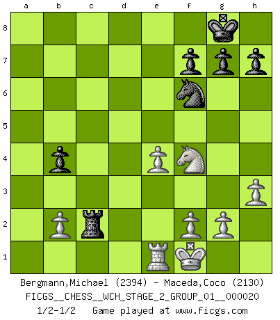 Last move : 1/2-1/2 2019 November 1 18:57:53 [Event "FICGS__CHESS__WCH_STAGE_2_GROUP_01__000020"] [Site "FICGS"] [Date "2019.08.03"] [Round "1"] [White "Bergmann,Michael"] [Black "Maceda,Coco"] [Result "1/2-1/2"] [WhiteElo "2394"] [BlackElo "2130"] 1.d4 d5 2.c4 e6 3.Nf3 Nf6 4.Nc3 c6 5.e3 Nbd7 6.Qc2 Bd6 7.Bd3 dxc4 8.Bxc4 O-O 9.O-O b5 10.Bd3 Bb7 11.a3 a5 12.e4 e5 13.Nxe5 Nxe5 14.dxe5 Bxe5 15.h3 Ba6 16.Rd1 Qe7 17.Be3 b4 18.axb4 Bxd3 19.Rxd3 axb4 20.Rxa8 Rxa8 21.Na4 Qe8 22.Nc5 Ra1+ 23.Bc1 Bc7 24.Kf1 Bb6 25.Nb3 Ra8 26.Be3 Bxe3 27.Rxe3 Qe6 28.Re1 c5 29.Nxc5 Rc8 30.Nxe6 Rxc2 31.Nf4 1/2-1/2 Queen's gambit declined Kingside Castling by player Black (move 8) Kingside Castling by player White (move 9) This chess game ended in a draw. Follow this game move after move (download)My style is somewhere between that of Tal and Petrosian. (Reshevsky) Alle Schachspieler sollten auch ein Hobby haben. (Savielly Grigorievitsch Tartakower) ¿Cual es el objetivo de jugar una apertura de gambito?... Para adquirir una reputación de ser un jugador apuesto a costo de perder el juego. (Siegbert Tarrasch) Les ravages du H expliquent la différence de niveau entre Tal et Thal [Abergel]. Tomorrow's what you make of it. (Horatio Caine, C.S.I. Miami)