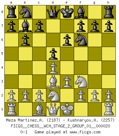 Last move : 0-1 2019 September 19 18:5:46 [Event "FICGS__CHESS__WCH_STAGE_2_GROUP_01__000020"] [Site "FICGS"] [Date "2019.08.03"] [Round "1"] [White "Meza Martinez,Alcides Ivan"] [Black "Kushnaryov,Andrey"] [Result "0-1"] [WhiteElo "2187"] [BlackElo "2257"] 1.d4 Nf6 2.Nf3 e6 3.e3 b6 4.Bd3 Bb7 5.Nbd2 d5 0-1 This chess game has been lost on time (started : 2019.08.03 0:16:12) Queen's pawn : Yusupov-Rubinstein system Player Black won this chess game. Follow this game move after move (download)Alekhine is a poet who creates a work of art out of something that would hardly inspire another man to send home a picture post card. (Max Euwe) Ich glaube, ich kenne inzwischen die Gründe für mein Versagen: schachliche Charakterfehler. Ich war nie ein Wunderkind und in meiner gesamten menschlichen Entwicklung immer zu langsam. (Viktor Kortschnoi) Si no le temes a Spassky, entonces elimino el elemento del dinero. (Jim Slater) Le profane ne songe pas à la somme de jouissance dont il se prive, qui méconnaît ce jeu aux ressources aussi variées que passionnantes. (Jean-Marie Jeanton-Lamarche) I just play for fun. (Anna Kournikova)