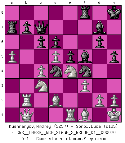 Last move : 0-1 2019 November 5 11:48:25 [Event "FICGS__CHESS__WCH_STAGE_2_GROUP_01__000020"] [Site "FICGS"] [Date "2019.08.03"] [Round "1"] [White "Kushnaryov,Andrey"] [Black "Sorbi,Luca"] [Result "0-1"] [WhiteElo "2257"] [BlackElo "2185"] 1.d4 Nf6 2.Nf3 g6 3.c4 Bg7 4.Nc3 O-O 5.e4 d6 6.Be2 e5 7.O-O Nc6 8.d5 Ne7 9.b4 Nh5 10.Re1 f5 11.a4 a5 12.bxa5 Rxa5 13.Bd2 Nf6 14.exf5 Nxf5 15.Bd3 Ra8 16.Ng5 Nd4 17.f3 Nh5 18.Nge4 Nf4 19.Bf1 c6 20.Rb1 Qc7 21.Rb2 Kh8 22.Kh1 Bf5 23.Qb1 Ra7 24.a5 h5 0-1 This chess game has been lost on time (started : 2019.08.03 0:16:12) King's Indian : East Indian defense Kingside Castling by player Black (move 4) Kingside Castling by player White (move 7) Player Black won this chess game. Follow this game move after move (download)Only the player with the initiative has the right to attack. (Wilhelm Steinitz) Wie gewinnt Tal? Er entwickelt alle seine Figuren in die Brettmitte und opfert sie dann irgendwo. (Robert James Fischer) No es suficiente ser un buen jugador, se debe también de jugar bién. (Siegbert Tarrasch) Lorsque vous vous retrouvez devant une position atroce, ne tendez pas un ultime piège dérisoire avec l'intention d'abandonner si l'adversaire le déjoue ! Faites-vous plutôt un devoir de résister comme si votre vie en dépendait. Jouez le coup qui vous déplairait au centuple si vous étiez dans la peau de votre tortionnaire ! Have no fear of perfection - you'll never reach it. (Salvador Dali)