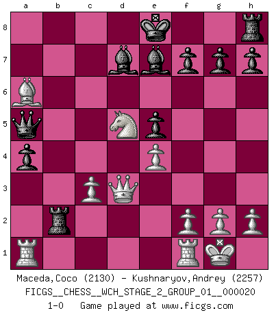 Last move : 1-0 2019 November 5 11:48:25 [Event "FICGS__CHESS__WCH_STAGE_2_GROUP_01__000020"] [Site "FICGS"] [Date "2019.08.03"] [Round "1"] [White "Maceda,Coco"] [Black "Kushnaryov,Andrey"] [Result "1-0"] [WhiteElo "2130"] [BlackElo "2257"] 1.e4 c5 2.Nf3 Nc6 3.d4 cxd4 4.Nxd4 Nf6 5.Nc3 e5 6.Ndb5 d6 7.Bg5 a6 8.Na3 b5 9.Nd5 Be7 10.Bxf6 Bxf6 11.c3 Rb8 12.Nc2 Bg5 13.a4 bxa4 14.Ncb4 Nxb4 15.Nxb4 Bd7 16.Bxa6 Qa5 17.Qxd6 Rb6 18.Qd3 Be7 19.Nd5 Rxb2 20.O-O 1-0 This chess game has been lost on time (started : 2019.08.03 0:16:12) Sicilian : Pelikan (Lasker/Sveshnikov) variation Kingside Castling by player White (move 20) Player White won this chess game. Follow this game move after move (download)At this time Fischer is simply a level above all the best Chessplayers in the world. (John Jacobs) Ich habe Kasparov in Rente geschickt. (Veselin Topalov) La señal de un Gran Maestro es su habilidad de ganar una partida rápidamente y sin dolor. (Irving Chernev) Le système Elo représente seulement une moyenne. Il est simplement un indicateur de votre stabilité. (Anatoli Karpov) Strategy without tactics is the slowest route to victory. Tactics without strategy is the noise before defeat. (Sun Tzu)