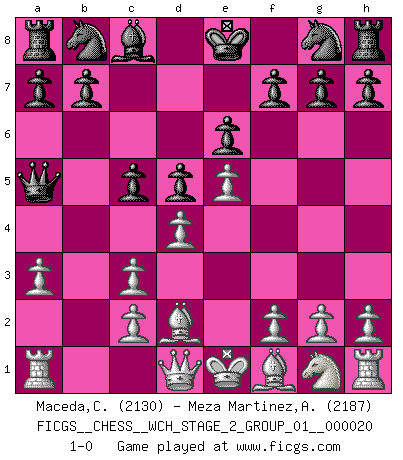 Last move : 1-0 2019 September 20 3:43:5 [Event "FICGS__CHESS__WCH_STAGE_2_GROUP_01__000020"] [Site "FICGS"] [Date "2019.08.03"] [Round "1"] [White "Maceda,Coco"] [Black "Meza Martinez,Alcides Ivan"] [Result "1-0"] [WhiteElo "2130"] [BlackElo "2187"] 1.e4 e6 2.d4 d5 3.Nc3 Bb4 4.e5 c5 5.a3 Bxc3+ 6.bxc3 Qa5 7.Bd2 1-0 French : Winawer, Advance variation Player White won this chess game. Follow this game move after move (download)Winning isn't everything... but losing is nothing. (Mednis) Die Neutralität betrachte ich als eine schwere Krankheit. (Viktor Kortschnoi) Diferente gente reacciona diferentemente en aceptar la derrota. (Bobby Fischer) Des combinaisons [dans le jeu d'échecs] pareilles à des mélodies. Je crois entendre pour ainsi dire la musique des coups... (Vladimir Nabokov) The faster the computer, the slower the brain. (Thibault de Vassal)