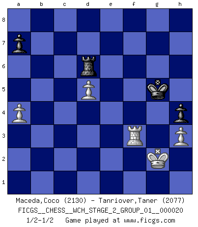 Last move : 1/2-1/2 2019 December 18 15:52:3 [Event "FICGS__CHESS__WCH_STAGE_2_GROUP_01__000020"] [Site "FICGS"] [Date "2019.08.03"] [Round "1"] [White "Maceda,Coco"] [Black "Tanriover,Taner"] [Result "1/2-1/2"] [WhiteElo "2130"] [BlackElo "2077"] 1.d4 Nf6 2.Nf3 d5 3.c4 c6 4.Nc3 Ne4 5.e3 e6 6.Bd3 f5 7.Ne5 g6 8.O-O Nd7 9.Nxd7 Bxd7 10.f3 Nxc3 11.bxc3 Bd6 12.e4 dxe4 13.fxe4 fxe4 14.c5 Bb8 15.Qg4 exd3 16.Bg5 h5 17.Qh4 Qc7 18.Bf4 Qd8 19.Qg3 g5 20.Bxb8 Rxb8 21.Qe5 Rg8 22.Rf6 Rc8 23.Rxe6+ Bxe6 24.Qxe6+ Qe7 25.Qxc8+ Kf7 26.Qf5+ Kg7 27.Qxd3 h4 28.a4 Kh6 29.Rf1 Rg6 30.Qf3 Kg7 31.c4 Re6 32.d5 cxd5 33.cxd5 Qxc5+ 34.Kh1 Rg6 35.Qf7+ Kh6 36.h3 Qd4 37.Qxb7 g4 38.Qf7 gxh3 39.gxh3 Qe4+ 40.Qf3 Qxf3+ 41.Rxf3 Kg5 42.Kg2 Rd6 1/2-1/2 Queen's pawn game Kingside Castling by player White (move 8) 10 pieces endgame at move 40 : White KRPPP , Black KQRPP WHITE : King + 1 Rook 3 Pawns BLACK : King + 1 Queen 1 Rook 2 Pawns 9 pieces endgame at move 41 : White KRPPP , Black KRPP WHITE : King + 1 Rook 3 Pawns BLACK : King + 1 Rook 2 Pawns This chess game ended in a draw. Follow this game move after move (download)Chess is war over the board. The object is to crush the opponents mind. (Bobby Fischer) Der vorletzte Fehler gewinnt. (Savielly Grigorievitsch Tartakower) El Ajedrez es el juego mas altamente simbólico, pero las agresiones estan por lo tanto aún mas francamente representadas en la partida. Tal vez comenzo como un juego de guerra; Algo como la representación de una batalla en miniatura entre las fuerzas de dos reinos. (Karl Meninger) A ce moment-là, je menaçais de comprendre la position ! (Clément L'Heureux) If you lose the game you should win the analysis! (Proverb)