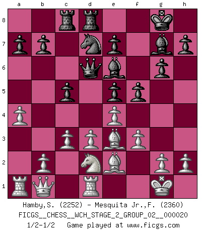 Last move : 1/2-1/2 2019 October 4 14:37:57 [Event "FICGS__CHESS__WCH_STAGE_2_GROUP_02__000020"] [Site "FICGS"] [Date "2019.08.03"] [Round "1"] [White "Hamby,Stephen"] [Black "Mesquita Jr.,Fausto Monteiro"] [Result "1/2-1/2"] [WhiteElo "2252"] [BlackElo "2360"] 1.Nf3 c5 2.e4 d6 3.Bb5+ Nd7 4.c3 Ngf6 5.Bd3 Ne5 6.Nxe5 dxe5 7.Be2 g6 8.d3 Bg7 9.Be3 Qd6 10.a4 O-O 11.Nd2 Be6 12.O-O Nd7 13.Qb1 f5 14.f3 Rfd8 15.Rd1 Rac8 1/2-1/2 Reti Opening Kingside Castling by player Black (move 10) Kingside Castling by player White (move 12) This chess game ended in a draw. Follow this game move after move (download)A man that will take back a move at Chess will pick a pocket. (Richard Fenton) Computer sind die einzigen Gegner, die nicht immer eine Ausrede auf Lager haben, wenn sie gegen mich verlieren. (Robert James Fischer) Si no le temes a Spassky, entonces elimino el elemento del dinero. (Jim Slater) Vous m'avez demandé de vous exposer quel est le fondement de la prière. Je ne fais que préparer les pièces du jeu sur la table... Nous sera-t-il permis d'en adopter les règles et si nous les appliquons scrupuleusement nous ne tarderons pas à faire mat le Roi divin ! Il ne pourra échapper à nos mains. (Sainte Thérèse d'Avila, Chemin de perfection) Statistics can be made to prove anything - even the truth. (Author unknown)