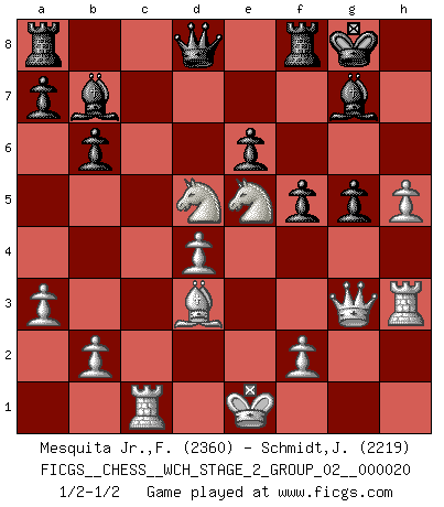 Last move : 1/2-1/2 2019 October 4 15:26:55 [Event "FICGS__CHESS__WCH_STAGE_2_GROUP_02__000020"] [Site "FICGS"] [Date "2019.08.03"] [Round "1"] [White "Mesquita Jr.,Fausto Monteiro"] [Black "Schmidt,Jonny"] [Result "1/2-1/2"] [WhiteElo "2360"] [BlackElo "2219"] 1.d4 d5 2.c4 e6 3.Nf3 Nf6 4.Bg5 Be7 5.e3 h6 6.Bxf6 Bxf6 7.Nc3 O-O 8.Rc1 dxc4 9.Bxc4 b6 10.Bd3 Na6 11.a3 c5 12.Qe2 cxd4 13.exd4 Nc7 14.Qe4 g6 15.Ne5 Bg7 16.h4 h5 17.Rh3 Nd5 18.g4 hxg4 19.Qxg4 Bb7 20.h5 g5 21.Nxd5 f5 22.Qg3 1/2-1/2 QGD Kingside Castling by player Black (move 7) This chess game ended in a draw. Follow this game move after move (download)Chess is a terrible game. If you have no center, your opponent has a freer position. If you do have a center, then you really have something to worry about ! (Siegbert Tarrasch) Ein guter Spieler hat immer Glück. (José Raúl Capablanca) Un sacrificio se refuta mucho mejor al aceptarlo. (Wilhelm Steinitz) Les écrivains ont utilisé les échecs pour analyser les côtés extrêmes de la nature humaine. Dans ce cadre, les échecs offrent un champ d'expérimentation idéal. Mais on pourrait faire la même chose avec la peinture. Et là, en vous référant à Van Gogh, vous ne tirerez pas de conclusion définitive sur les peintres. (Gary Kasparov) Life is like a play: it's not the length but the excellence of the acting that matters. (Seneca)