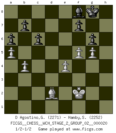 Last move : 1/2-1/2 2019 December 5 10:50:53 [Event "FICGS__CHESS__WCH_STAGE_2_GROUP_02__000020"] [Site "FICGS"] [Date "2019.08.03"] [Round "1"] [White "D Agostino,Gabriele"] [Black "Hamby,Stephen"] [Result "1/2-1/2"] [WhiteElo "2271"] [BlackElo "2252"] 1.d4 Nf6 2.c4 c6 3.Nc3 d5 4.e3 e6 5.Nf3 Nbd7 6.Qc2 Bd6 7.Bd3 O-O 8.O-O dxc4 9.Bxc4 a6 10.e4 e5 11.h3 exd4 12.Nxd4 Re8 13.Rd1 Qc7 14.a4 Nc5 15.Nf3 Be6 16.b4 Ncd7 17.Bxe6 Rxe6 18.Nd4 R6e8 19.Rb1 Nf8 20.f3 g6 21.Be3 Rac8 22.Qb2 Bh2+ 23.Kf1 Nh5 24.Nce2 Be5 25.Qc2 Bd6 26.Qd2 Ng3+ 27.Nxg3 Bxg3 28.Rb3 h5 29.Rd3 Rcd8 30.a5 Rd6 31.f4 Red8 32.Ke2 Bh4 33.Kf3 Qd7 34.g4 Ne6 35.Qc2 Be7 36.R3d2 Bf8 37.Nxe6 Qxe6 38.Rxd6 Rxd6 39.f5 Qd7 40.Rf1 hxg4+ 41.hxg4 Rd3 42.Ke2 Ra3 43.Qd2 Qxd2+ 44.Bxd2 Rg3 45.g5 Rg2+ 46.Rf2 Rxf2+ 47.Kxf2 1/2-1/2 Queen's pawn game Kingside Castling by player Black (move 7) Kingside Castling by player White (move 8) This chess game ended in a draw. Follow this game move after move (download)The blunders are all there on the board, waiting to be made. (Savielly Tartakover) Der zweitbeste Zug ist oft der einzig richtige. (Savielly Grigorievitsch Tartakower) Dejen al perfeccionista jugar por correo. (Yasser Seirawan) Seul un grand joueur sait à quel point il joue faiblement. (Xavier Tartacover) Fortune favours the audacious. (Desiderius Erasmus)
