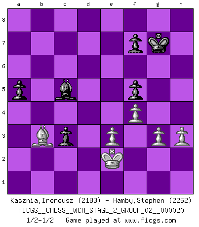 Last move : 1/2-1/2 2019 November 14 11:7:26 [Event "FICGS__CHESS__WCH_STAGE_2_GROUP_02__000020"] [Site "FICGS"] [Date "2019.08.03"] [Round "1"] [White "Kasznia,Ireneusz"] [Black "Hamby,Stephen"] [Result "1/2-1/2"] [WhiteElo "2183"] [BlackElo "2252"] 1.Nf3 Nf6 2.g3 e6 3.Bg2 d5 4.d4 Be7 5.c4 O-O 6.O-O Nbd7 7.Qc2 c6 8.b3 b6 9.Bb2 Bb7 10.Rd1 h6 11.e3 Rc8 12.Qe2 dxc4 13.bxc4 c5 14.d5 exd5 15.cxd5 Bxd5 16.Nc3 Bc6 17.Nb5 Bxb5 18.Qxb5 Qc7 19.Rac1 Rfd8 20.Nd4 Ne5 21.f4 Neg4 22.Qe2 Bf8 23.Nc2 c4 24.Bd4 h5 25.h3 Nh6 26.Bxf6 gxf6 27.Qxh5 Rd3 28.Kf2 Rcd8 29.Nd4 Qc5 30.Qxc5 bxc5 31.Rxd3 cxd3 32.Nc6 Rd6 33.Bf3 d2 34.Rb1 Nf5 35.Na5 Ra6 36.Nc4 Nd6 37.Nxd6 Rxa2 38.Ke2 Bxd6 39.Rd1 c4 40.Rxd2 Rxd2+ 41.Kxd2 Bb4+ 42.Kd1 a5 43.Bd5 c3 44.Bb3 f5 45.Kc2 Kg7 46.Ba4 Kg6 47.Kd3 Bc5 48.Bc2 Kh6 49.Ke2 Ba7 50.Kd3 Kg7 51.Bb3 Bc5 52.Ke2 1/2-1/2 Reti Opening Kingside Castling by player Black (move 5) Kingside Castling by player White (move 6) This chess game ended in a draw. Follow this game move after move (download)I feel as if I were a piece in a game of Chess, when my opponent says of it: That piece cannot be moved. (Soren Kierkegaard) Wenn du auf das Glück wartest, wird das Leben ziemlich langweilig. (Mikhail Nekhemyevich Tal) Para mi, el Ajedrez es la vida y cada partida es como una nueva vida. Todo jugador de Ajedrez suele vivir muchas vidas durante su vida. (Eduard Gufeld) Je crois qu'il existe des manières très spécifiques de jouer efficacement contre une machine. Evidemment, nous n'avons aucune chance en technique pure, parce que l'ordinateur calcule de manière parfaite. Mais lorsque nous faisons appel à notre cerveau, en utilisant l'intuition et la compréhension, alors nous restons beaucoup plus forts. (Anatoli Karpov) Inventor: A person who makes an ingenious arrangement of wheels, levers and springs, and believes it civilization. (Ambrose Bierce, The Devil's Dictionary)