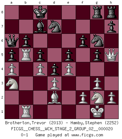 Last move : 0-1 2019 November 14 20:21:28 [Event "FICGS__CHESS__WCH_STAGE_2_GROUP_02__000020"] [Site "FICGS"] [Date "2019.08.03"] [Round "1"] [White "Brotherton,Trevor"] [Black "Hamby,Stephen"] [Result "0-1"] [WhiteElo "2013"] [BlackElo "2252"] 1.Nf3 d5 2.c4 d4 3.b4 f6 4.e3 e5 5.a3 c5 6.d3 Ne7 7.Be2 Nf5 8.O-O a5 9.e4 Ne7 10.b5 Ng6 11.Ne1 Be6 12.Bg4 Qc8 13.Bh5 Nd7 14.a4 Bd6 15.g3 Qc7 16.Ng2 O-O-O 17.Bg4 Ngf8 18.b6 Qxb6 19.Na3 Qa6 20.Rb1 Bxg4 21.Qxg4 g5 22.Bd2 Ng6 23.Rb5 Bc7 24.Qh5 Rdg8 25.Rfb1 b6 0-1 This chess game has been lost on time (started : 2019.08.03 0:16:10) Reti : Advance variation Kingside Castling by player White (move 8) Queenside Castling by player Black (move 16) Player Black won this chess game. Follow this game move after move (download)It is always better to sacrifice your opponent's men. (Savielly Tartakower) Aljechin war kein Nazi. Er war ein Opportunist. Ein schrecklicher Mann. Er liebte Geld über alles und würde für Geld ein Jude, ein Katolik oder ein Protestant werden. (Miguel Najdorf) No hay un Gran Maestro de Ajedrez que sea normal; solo se diferencían ellos por la magnitud de su locura. (Viktor Korchnoi) Votre prénom est 'Tactique', votre deuxième prénom est 'Tactique' et votre nom est 'Tactique'. (Ken Smith) Art disturbs, science reassures. (Georges Braque, Le Jour et la Nuit)