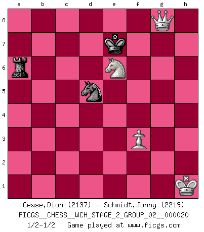Last move : 1/2-1/2 2020 January 27 14:12:20 [Event "FICGS__CHESS__WCH_STAGE_2_GROUP_02__000020"] [Site "FICGS"] [Date "2019.08.03"] [Round "1"] [White "Cease,Dion"] [Black "Schmidt,Jonny"] [Result "1/2-1/2"] [WhiteElo "2137"] [BlackElo "2219"] 1.e4 c5 2.Nf3 Nc6 3.d4 cxd4 4.Nxd4 Nf6 5.Nc3 e5 6.Ndb5 d6 7.Nd5 Nxd5 8.exd5 Nb8 9.a4 Be7 10.Be2 O-O 11.O-O Nd7 12.Bd2 a6 13.Na3 f5 14.a5 f4 15.Nc4 Rb8 16.Bb4 Rf6 17.Re1 Rh6 18.Bd3 Bf8 19.Bf5 Nb6 20.Bxc8 Nxc8 21.Qd3 Ne7 22.Nd2 b5 23.axb6 Qxb6 24.Ba3 Qd4 25.Qxd4 exd4 26.Nf3 Nxd5 27.Nxd4 Nc7 28.c4 Rf6 29.Rad1 h6 30.h4 g5 31.h5 Kf7 32.Rd2 Ra8 33.Rde2 a5 34.f3 a4 35.Kh2 Re8 36.Rxe8 Nxe8 37.Bb4 Ng7 38.Ra1 Nxh5 39.Rxa4 Ng3 40.Bc3 d5 41.cxd5 Rd6 42.Ra7+ Kg8 43.Ra5 Nf1+ 44.Kg1 Ne3 45.Ra8 Nxd5 46.Nf5 Rd7 47.Nxh6+ Kh7 48.Ng4 Bg7 49.Bxg7 Kxg7 50.Ra5 Rd8 51.Nf2 Kg6 52.Ra6+ Kf7 53.Ne4 g4 54.fxg4 Rb8 55.Ng5+ Kg8 56.Ne6 Rxb2 57.g5 Kf7 58.g6+ Ke7 59.Kh1 f3 60.gxf3 Rb6 61.g7 Rxa6 62.g8Q 1/2-1/2 Sicilian : Pelikan (Lasker/Sveshnikov) variation Kingside Castling by player Black (move 10) Kingside Castling by player White (move 11) 10 pieces endgame at move 54 : White KRNPPP , Black KRNP WHITE : King + 1 Rook 1 Knight 3 Pawns BLACK : King + 1 Rook 1 Knight 1 Pawn 9 pieces endgame at move 56 : White KRNPP , Black KRNP WHITE : King + 1 Rook 1 Knight 2 Pawns BLACK : King + 1 Rook 1 Knight 1 Pawn 8 pieces endgame at move 60 : White KRNPP , Black KRN WHITE : King + 1 Rook 1 Knight 2 Pawns BLACK : King + 1 Rook 1 Knight 7 pieces endgame at move 61 : White KNPP , Black KRN WHITE : King + 1 Knight 2 Pawns BLACK : King + 1 Rook 1 Knight Promotion Queen by player White (move 62) This chess game ended in a draw. Follow this game move after move (download)The passed pawn is a criminal, who should be kept under lock and key. Mild measures, such as police surveillance, are not sufficient. (Nimzovitch) Smyslow ist ein Beweis dafür, dass ich noch zehn Jahre spielen kann! [der 75 jährige über den 85 jährigen] (Viktor Kortschnoi) En el tablero, la mentira e hipocresía no sobreviven mucho. (Emanuel Lasker) Shah mat. Le roi est mort. Cri de fierté d'un joueur venant de terrasser son adversaire, courtoisement, sans effusion de sang. Are you threatening me, Master Jedi ? (Chancellor Palpatine in Star Wars ep.3)