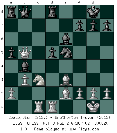 Last move : 1-0 2019 November 14 21:16:18 [Event "FICGS__CHESS__WCH_STAGE_2_GROUP_02__000020"] [Site "FICGS"] [Date "2019.08.03"] [Round "1"] [White "Cease,Dion"] [Black "Brotherton,Trevor"] [Result "1-0"] [WhiteElo "2137"] [BlackElo "2013"] 1.e4 c5 2.Nf3 Nc6 3.Bb5 e6 4.O-O Nge7 5.d4 cxd4 6.Nxd4 Qb6 7.Nxc6 bxc6 8.Bd3 Ng6 9.c4 Be7 10.Nc3 O-O 11.Rb1 Rd8 12.Be3 Qc7 13.Qc2 Ne5 14.Be2 d5 15.cxd5 cxd5 16.exd5 exd5 17.Qa4 Be6 18.Rbc1 Qb8 19.b3 a5 20.Rfd1 Bb4 21.Qb5 1-0 This chess game has been lost on time (started : 2019.08.03 0:16:10) Sicilian : Nimzovich-Rossolimo attack (without ...d6) Kingside Castling by player White (move 4) Kingside Castling by player Black (move 10) Player White won this chess game. Follow this game move after move (download)Of all my Russian books, the defense contains and diffuses the greatest 'warmth' which may seem odd seeing how supremely abstract Chess is supposed to be. (Vladimir Nabokov) Ein Schachspiel besteht aus drei Phasen: Die erste, wenn du hofftst den Vorteil zu haben, die zweite, wenn du glaubst einen Vorteil zu haben, und die dritte.... wenn du weißt Du wirst verlieren. (Savielly Grigorievitsch Tartakower) El Ajedrez es tortura mental. (Garry Kasparov) On peut tirer plus d'utilité d'une partie perdue que de 100 parties gagnées. (Capablanca) If only faces could talk... (Pat Summerall, Sportscaster during the Super Bowl)