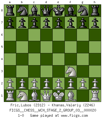 Last move : 1-0 2019 September 4 0:44:10 [Event "FICGS__CHESS__WCH_STAGE_2_GROUP_03__000020"] [Site "FICGS"] [Date "2019.08.03"] [Round "1"] [White "Fric,Lubos"] [Black "Khanas,Valeriy"] [Result "1-0"] [WhiteElo "2312"] [BlackElo "2246"] 1.Nf3 1-0 This chess game has been lost on time (started : 2019.08.03 0:16:12) Reti Opening Player White won this chess game. Follow this game move after move (download)There is only one thing Fischer does in Chess without pleasure: to lose ! (Boris Spassky) Ich würde mich als ganz normalen Jungen bezeichnen [Im Alter von 12]. (Sergej Karjakin) Cuando tengas duda... ¡juega al Ajedrez!. (Tevis) Lorsque vous vous retrouvez devant une position atroce, ne tendez pas un ultime piège dérisoire avec l'intention d'abandonner si l'adversaire le déjoue ! Faites-vous plutôt un devoir de résister comme si votre vie en dépendait. Jouez le coup qui vous déplairait au centuple si vous étiez dans la peau de votre tortionnaire ! Fear is the path to the dark side. Fear leads to anger; anger leads to hate; hate leads to suffering. I sense much fear in you. (Master Yoda in Star Wars ep.1)