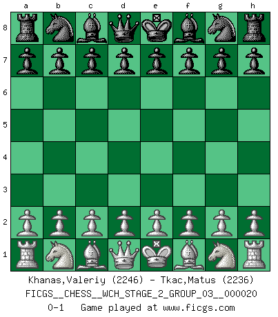 Last move : 0-1 2019 September 2 11:7:23 [Event "FICGS__CHESS__WCH_STAGE_2_GROUP_03__000020"] [Site "FICGS"] [Date "2019.08.03"] [Round "1"] [White "Khanas,Valeriy"] [Black "Tkac,Matus"] [Result "0-1"] [WhiteElo "2246"] [BlackElo "2236"] 0-1 This chess game has been lost on time (started : 2019.08.03 0:16:12) Player Black won this chess game. Follow this game move after move (download)Chess is as much a mystery as women. (Purdy) Modernes Schach erfordert enorme Anspannung. Es ist für einen normalen Menschen unmöglich das auszuhalten. (Viktor Kortschnoi) El juego de Damas es para vagabundos. (Paul Morphy) En blitz, le Cavalier l'emporte sur le Fou. (Vlastimil Hort) 'preceded by its own quotation yields a falsehood' preceded by its own quotation yields a falsehood. (W. V. O. Quine - Set Theory And Its Logic, 1953)