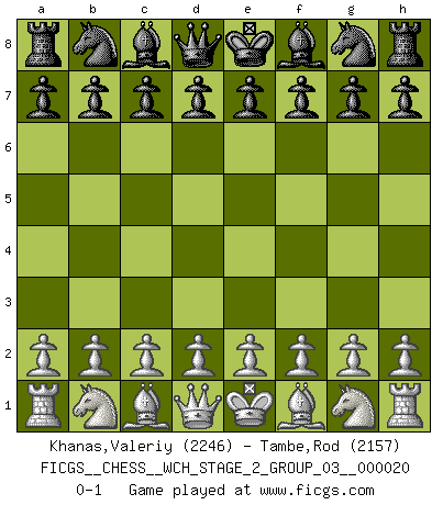 Last move : 0-1 2019 September 2 11:7:23 [Event "FICGS__CHESS__WCH_STAGE_2_GROUP_03__000020"] [Site "FICGS"] [Date "2019.08.03"] [Round "1"] [White "Khanas,Valeriy"] [Black "Tambe,Rod"] [Result "0-1"] [WhiteElo "2246"] [BlackElo "2157"] 0-1 This chess game has been lost on time (started : 2019.08.03 0:16:12) Player Black won this chess game. Follow this game move after move (download)Fischer was a master of clarity and a king of artful positioning. His opponents would see where he was going but were powerless to stop him. (Bruce Pandolfini) Frage des Reporters: -Worin besteht das Ziel von Gambiteröffnungen? Antwort: -Auf Kosten der Partie einen Ruf als Angriffspieler zu erwerben.- (Siegbert Tarrasch) Cuando tengo las piezas blancas, yo gano porque soy blanco; Cuando tengo las piezas negras, yo gano porque soy Bogolyubov. (Bogolyubov) Le succès, c'est être capable d'aller d'échec en échec sans perdre son enthousiasme. (Winston Churchill) When you have everything, sometimes it feels like nothing. (Horatio Caine, C.S.I. Miami)
