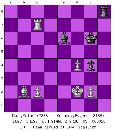 Last move : 1-0 2019 December 13 16:21:38 [Event "FICGS__CHESS__WCH_STAGE_2_GROUP_03__000020"] [Site "FICGS"] [Date "2019.08.03"] [Round "1"] [White "Tkac,Matus"] [Black "Kopasov,Evgeny"] [Result "1-0"] [WhiteElo "2236"] [BlackElo "2158"] 1.e4 e6 2.d4 d5 3.Nc3 Bb4 4.e5 Ne7 5.a3 Bxc3+ 6.bxc3 c5 7.Qg4 O-O 8.Bd3 f5 9.exf6 Rxf6 10.Bg5 Rf7 11.Qh5 g6 12.Qd1 Nbc6 13.Nf3 Qa5 14.Bd2 c4 15.Be2 Nf5 16.O-O Bd7 17.a4 Re8 18.Re1 h6 19.Qc1 e5 20.Nxe5 Nxe5 21.dxe5 Rxe5 22.Bg4 Rxe1+ 23.Qxe1 Re7 24.Qd1 Kh7 25.h3 a6 26.Qf3 d4 27.Qxb7 dxc3 28.Bf4 Bxa4 29.Qb8 Qd5 30.Bxf5 Bc6 31.f3 Qc5+ 32.Kh2 Qxf5 33.Rxa6 Bd7 34.Qd6 Re2 35.Kg3 Qe6 36.Qxe6 Rxe6 37.Ra7 Re7 38.Rc7 g5 39.Bc1 Kg6 40.Kf2 h5 41.Rxc4 Rh7 42.Rxc3 g4 43.hxg4 hxg4 44.f4 Rh8 45.Rc7 Be6 46.Bb2 1-0 French : Winawer, Advance variation Kingside Castling by player Black (move 7) Kingside Castling by player White (move 16) 10 pieces endgame at move 43 : White KRBPPP , Black KRBP WHITE : King + 1 Rook 1 Bishop 3 Pawns BLACK : King + 1 Rook 1 Bishop 1 Pawn Player White won this chess game. Follow this game move after move (download)You are for me the Queen on d8 and I am the Pawn on d7 !! (Eduard Gufeld) Ein Großmeister muß tausende Partien in seinem Kopf speichern, denn diese sind für Ihn, was die Worte der Muttersprache für gewöhnliche Leute sind, oder Noten für Musiker... (Garry Kasparov) Si el Ajedrez es una ciencia, es la mas inexacta. Si el Ajedrez es un arte, es demasiado inexacto para ser visto como tal. Si el Ajedrez es un deporte, es demasiado esotérico. Si el Ajedrez es un juego, es demasiado exigente para ser solo un juego. Si el Ajedrez es una aventura, es una muy demandante. Si el Ajedrez es una pasión, es una muy gratificante. Si el Ajedrez es la vida, es una muy triste. (Anónimo) Shah mat. Le roi est mort. Cri de fierté d'un joueur venant de terrasser son adversaire, courtoisement, sans effusion de sang. In my experience, there's no such thing as luck. (Obi-Wan Kenobi in Star Wars ep.4)