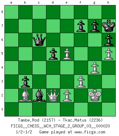 Last move : 1/2-1/2 2019 December 10 20:8:37 [Event "FICGS__CHESS__WCH_STAGE_2_GROUP_03__000020"] [Site "FICGS"] [Date "2019.08.03"] [Round "1"] [White "Tambe,Rod"] [Black "Tkac,Matus"] [Result "1/2-1/2"] [WhiteElo "2157"] [BlackElo "2236"] 1.d4 Nf6 2.Nf3 e6 3.c4 b6 4.g3 Ba6 5.Nbd2 Bb4 6.Qc2 Bb7 7.Bg2 Be4 8.Qd1 O-O 9.O-O Bxd2 10.Qxd2 d5 11.Qc3 h6 12.Rd1 Qe7 13.b3 Rc8 14.Bb2 Nbd7 15.Bh3 a5 16.Nd2 Bg6 17.Bg2 c6 18.a4 Qd8 19.Qe3 Rab8 20.h3 b5 21.axb5 cxb5 22.c5 Ra8 23.b4 Nb8 24.Rxa5 Rxa5 25.bxa5 Qxa5 26.Ra1 Qc7 27.Qf4 Qd7 28.Nb3 Nc6 29.Qd6 Qe8 30.Na5 b4 31.Nxc6 Rxc6 32.Qf4 Rc8 33.Qd2 Qb5 34.h4 Ne4 35.Bxe4 Bxe4 36.f3 Bf5 37.g4 Bh7 38.Kf2 Qb8 39.Kg2 b3 40.Ra6 Bc2 41.h5 Kh7 42.Bc1 e5 43.Rb6 Qc7 44.dxe5 Qxc5 45.Rb7 Rc7 46.Rxc7 Qxc7 47.Bb2 Qc6 1/2-1/2 Queen's pawn game Kingside Castling by player Black (move 8) Kingside Castling by player White (move 9) This chess game ended in a draw. Follow this game move after move (download)Chess mastery essentially consists of analyzing Chess positions accurately. (Mikhail Botvinnik) Man kann eine Schachpartie nur gewinnen, wenn das Gleichgewicht gestört ist. In einer Stellung mit ungestörtem Gleichgewicht ist auch das größte Genie hilflos - in der Stellung steckt dann eben kein genialer Einfall. (Wilhelm Steinitz) La batalla por la última verdad nunca sera ganada. Y es por eso que el Ajedrez es tan fascinante. (Hans Kmoch) Tous ces prétendus hommes politiques sont les pions, les Cavaliers, les Tours ou les Fous d'une partie d'échecs qui se jouera tant qu'un hasard ne renversera pas l'échiquier. (Honoré de Balzac) Two beer, or not two beer. (Unknown)