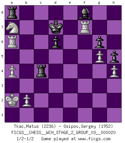 Last move : 1/2-1/2 2019 October 21 11:26:32 [Event "FICGS__CHESS__WCH_STAGE_2_GROUP_03__000020"] [Site "FICGS"] [Date "2019.08.03"] [Round "1"] [White "Tkac,Matus"] [Black "Osipov,Sergey"] [Result "1/2-1/2"] [WhiteElo "2236"] [BlackElo "1952"] 1.e4 c5 2.Nf3 d6 3.d4 cxd4 4.Nxd4 Nf6 5.Nc3 a6 6.f3 e5 7.Nb3 Be6 8.Be3 Be7 9.Qd2 O-O 10.a3 Nbd7 11.O-O-O b5 12.g4 Nb6 13.g5 Nh5 14.Na5 Rc8 15.Kb1 Qc7 16.h4 g6 17.Rh2 Rfe8 18.Nd5 Nxd5 19.exd5 Bd7 20.Bh3 Bxh3 21.Rxh3 Qd7 22.R3h1 f5 23.Nc6 Bf8 24.Bf2 Bg7 25.Rhe1 Bf8 26.Rc1 f4 27.c4 bxc4 28.Ka2 Qh3 29.Qe2 Ng3 30.Bxg3 fxg3 31.Rh1 Qf5 32.Rxc4 Rc7 33.Rg1 Rb7 34.a4 e4 35.fxe4 Qxd5 36.Qc2 Qf7 37.Rxg3 Rc7 38.Qb3 Rb8 39.Rb4 Rbc8 40.Nb8 a5 41.Qxf7+ Kxf7 42.Rb5 Ke6 43.Rgb3 Rc4 44.Rxa5 Rxe4 45.Ra6 h5 46.Nc6 Rc4 47.Rf3 Kd7 48.Na7 Ra8 49.Rf7+ Ke6 50.Rf6+ Kd7 51.Rf7+ Ke6 52.Rf6+ Kd7 53.Rf7+ 1/2-1/2 Sicilian : Najdorf Kingside Castling by player Black (move 9) Queenside Castling by player White (move 11) This chess game ended in a draw. Follow this game move after move (download)Not all artists are Chess players, but all Chess players are artists. (Marcel Duchamp) Lisa Lane, amerikanische Schachmeisterin, hatte Fischer einmal als stärksten lebenden Spieler bezeichnet. Antwort: Das ist richtig, aber Lisa Lane ist eigentlich nicht in der Lage, das zu beurteilen. (Robert James Fischer) De todos mis libros Rusos, la defensa contiene y difunde el 'calor' mas grande que pudiese verse extraño al observar lo supremamente abstracto que el Ajedrez supuestamente es. (Vladimir Nabokov) Roi des jeux et jeu des rois, les échecs portent en eux un sentiment d'infini. Ils donnent à celui qui s'est efforcé d'en approfondir les arcanes l'impression de n'être pas à la mesure de l'homme; en fait, ils constituent un résumé de l'univers, un microcosme, et figurent cette grande échelle qui, dans les plans de la lumière descend jusqu'à la matière, qui des abîmes insondables remonte jusqu'en l'infini de Dieu. (Pyrame) It is a good thing for an uneducated man to read books of quotations. (Winston Churchill)