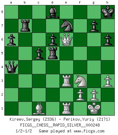 Last move : 1/2-1/2 2019 August 12 14:12:25 [Event "FICGS__CHESS__RAPID_SILVER__000248"] [Site "FICGS"] [Date "2019.08.03"] [Round "2"] [White "Kireev,Sergey"] [Black "Perikov,Yuriy"] [Result "1/2-1/2"] [WhiteElo "2336"] [BlackElo "2171"] 1.e4 e5 2.Nf3 Nc6 3.Bb5 a6 4.Ba4 Nf6 5.O-O Be7 6.Re1 b5 7.Bb3 O-O 8.d3 d6 9.a4 b4 10.a5 Be6 11.Bxe6 fxe6 12.Nbd2 Qe8 13.c3 Rb8 14.d4 bxc3 15.bxc3 exd4 16.cxd4 Rb5 17.Ba3 Qd7 18.h3 Rfb8 19.Qc2 Nxa5 20.Re3 Bd8 21.Rae1 Qc6 22.Qa2 Qd7 23.Qc2 Nc6 24.d5 exd5 25.exd5 Ne7 26.Nd4 Rxd5 27.Qc4 c5 28.N4f3 Kh8 29.Ne4 Qb5 30.Qc2 Nxe4 31.Qxe4 h6 32.Qe6 Qa4 33.Bc1 Rb7 1/2-1/2 Ruy Lopez : Closed, 7...O-O Kingside Castling by player White (move 5) Kingside Castling by player Black (move 7) This chess game ended in a draw. Follow this game move after move (download)Play the opening like a book, the middle game like a magician, and the endgame like a machine. (Spielmann) Schach ist ein schwarz-weisser Dschungel. (Garry Kasparov) El Ajedrez es sobre todo, ¡una pelea!. (Emanuel Lasker) Un journaliste : 'Vous préférez avoir une dame de plus sur l'échiquier ou au lit ?' Boris Spassky : 'Ca dépend de la position.' In theory there is no difference between theory and practice. In practice there is. (Yogi Berra)