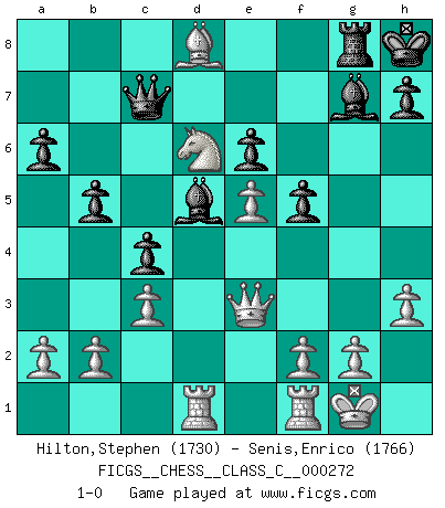 Last move : 1-0 2019 August 27 22:14:51 [Event "FICGS__CHESS__CLASS_C__000272"] [Site "FICGS"] [Date "2019.08.03"] [Round "1"] [White "Hilton,Stephen"] [Black "Senis,Enrico"] [Result "1-0"] [WhiteElo "1730"] [BlackElo "1766"] 1.d4 Nf6 2.Nf3 g6 3.Bf4 Bg7 4.e3 d6 5.Be2 O-O 6.h3 Nbd7 7.c3 c5 8.Nbd2 a6 9.O-O b5 10.e4 Nh5 11.Bh2 c4 12.e5 dxe5 13.Nxe5 Nxe5 14.dxe5 e6 15.Bxh5 gxh5 16.Ne4 Bb7 17.Nd6 Bd5 18.Qxh5 Qc7 19.Bf4 Qe7 20.Qg4 f5 21.Qg3 Kh8 22.Bg5 Qc7 23.Rad1 Rg8 24.Qe3 Rad8 25.Bxd8 1-0 King's Indian : London system Kingside Castling by player Black (move 5) Kingside Castling by player White (move 9) Player White won this chess game. Follow this game move after move (download)Only the player with the initiative has the right to attack. (Wilhelm Steinitz) Mit sehr nachdenklichem Gesicht schreitet Bobby durch den Turniersaal. Was ist passiert?, fragt Lombardy. Ich stehe schlecht, antwortet Fischer. Lombardy: Dann biete doch einfach Remis an. Fischer: So schlecht stehe ich nun auch wieder nicht! (Robert James Fischer) El juego de Damas es para vagabundos. (Paul Morphy) Les Cavaliers se révèlent fort utiles dans les positions fermées. D'habitude, les Fous sont un peu plus forts que les Cavaliers dans les positions ouvertes. Qu'on le veuille ou non, il restera toujours des exceptions ! Always two there are. No more no less. A master, and an apprentice. (Master Yoda in Star Wars ep.1)