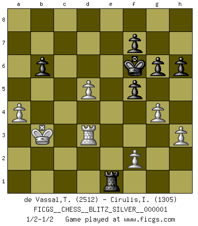 Last move : 1/2-1/2 2007 June 19 3:23:27 [Event "FICGS__CHESS__BLITZ_SILVER__000001"] [Site "FICGS"] [Date "2007.06.18"] [Round "1"] [White "de Vassal,Thibault"] [Black "Cirulis,Ilmars"] [Result "1/2-1/2"] [WhiteElo "2512"] [BlackElo "1305"] 1.d4 d5 2.c4 e6 3.Nc3 Nf6 4.Nf3 Nc6 5.e3 Bd6 6.c5 Be7 7.Bd3 O-O 8.a3 a5 9.Qc2 b6 10.cxb6 cxb6 11.Bd2 Bd7 12.Rc1 Qb8 13.O-O Rc8 14.Qb1 a4 15.Rfd1 g6 16.e4 dxe4 17.Nxe4 Nd5 18.Bb5 Qa7 19.Qd3 Na5 20.Rxc8+ Rxc8 21.Ne5 Bxb5 22.Qxb5 Nb3 23.Nc6 Qd7 24.Nxe7+ Qxe7 25.Qxa4 Qh4 26.Re1 Nxd2 27.Nxd2 Qf4 28.Nf3 Qf5 29.Qb5 Rc2 30.h3 Kg7 31.a4 h6 32.Kf1 Nf4 33.Qxf5 exf5 34.b3 Rb2 35.Re3 Rb1+ 36.Ne1 Nd5 37.Rf3 Nb4 38.Ke2 Rb2+ 39.Kd1 Kf6 40.g4 Nc6 41.d5 Nd4 42.Rd3 Rb1+ 43.Kd2 Nxb3+ 44.Kc2 Rxe1 45.Kxb3 1/2-1/2 QGD : 4.Nf3 Kingside Castling by player Black (move 7) Kingside Castling by player White (move 13) This chess game ended in a draw. Follow this game move after move (download)In Chess, just as in life, today's bliss may be tomorrow's poison. (Assaic) Der Bart als Geschlechtszeichen mitten im Gesicht ist obszön. Daher gefällt er den Weibern. [Zugegeben, kein Schachzitat, aber unglaublich originell] (Arthur Schopenhauer) Un sacrificio se refuta mucho mejor al aceptarlo. (Wilhelm Steinitz) Celui qui prend des risques peut perdre, celui qui n'en prend pas perd toujours. (Xavier Tartacover) A good programmer is someone who always looks both ways before crossing a one-way street. (Doug Linder)