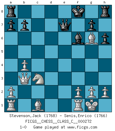 Last move : 1-0 2019 August 23 15:35:29 [Event "FICGS__CHESS__CLASS_C__000272"] [Site "FICGS"] [Date "2019.08.03"] [Round "1"] [White "Stevenson,Jack"] [Black "Senis,Enrico"] [Result "1-0"] [WhiteElo "1768"] [BlackElo "1766"] 1.e4 c6 2.d4 d5 3.e5 Bf5 4.Nf3 e6 5.Be2 Nd7 6.O-O c5 7.c4 Ne7 8.Nc3 cxd4 9.Qxd4 Nc6 10.Qf4 h6 11.cxd5 Ne7 12.dxe6 Bxe6 13.Nd4 Ng6 14.Qe4 Nc5 15.Qe3 Be7 16.b4 Nd7 17.Nxe6 fxe6 18.Bh5 Ndxe5 19.Qxe5 Bf6 20.Qxe6+ Qe7 21.Bxg6+ Kf8 22.Qb3 1-0 Caro-Kann : Advance variation Kingside Castling by player White (move 6) Player White won this chess game. Follow this game move after move (download)In Fischer's hands, a slight theoretical advantage is as good a being a Queen ahead. (Isaac Kashdan) Irgendwie scheint mir sonntags früh um 9 Uhr der Killerinstinkt verloren gegangen zu sein. (Alexej Shirov) Cada Peón es una Reina en potencia. (James Mason) Même si l'adversaire joue le coup analysé précédemment, recommencez l'analyse en voyant la nouvelle position. Première règle de Blumenfeld Somewhere in the world there is an epigram for every dilemma. (Hendrik Willem van Loon)