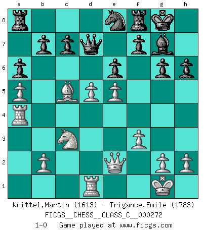 Last move : 1-0 2019 August 29 18:55:19 [Event "FICGS__CHESS__CLASS_C__000272"] [Site "FICGS"] [Date "2019.08.03"] [Round "1"] [White "Knittel,Martin"] [Black "Trigance,Emile"] [Result "1-0"] [WhiteElo "1613"] [BlackElo "1783"] 1.d4 Nf6 2.c4 g6 3.f3 d5 4.cxd5 Nxd5 5.e4 Nb6 6.Be3 Bg7 7.Nc3 Nc6 8.Bb5 Bd7 9.Nge2 a6 10.Bxc6 Bxc6 11.d5 Bb5 12.a4 Bxe2 13.Qxe2 Qd7 14.O-O O-O 15.a5 Nc8 16.Rfd1 Nd6 17.Bf2 h6 18.e5 Ne8 19.Ra4 e6 20.Bc5 1-0 King's Indian defense Kingside Castling by player White (move 14) Kingside Castling by player Black (move 14) Player White won this chess game. Follow this game move after move (download)Who is your opponent tonight, tonight I am playing against the Black pieces. (Akiba Rubinstein) Zu meiner Zeit war ein 20 jähriger ein junger Spieler, heute ist er ein Veteran. (Garry Kasparov) La caracteristica mas importante en la posición del Ajedrez es la actividad de las piezas. Esto es absolutamente fundamental en todas las fases del juego: Apertura, Juego Medio y especialmente Finales. La limitación primordial en la actividad de una pieza, es la estructuración de los Peones. (Michael Stean) Les échecs sont plus proches de l'art de l'assassinat que de l'art de la guerre. (Arturo Perez-Reverte) If you lose the game you should win the analysis! (Proverb)